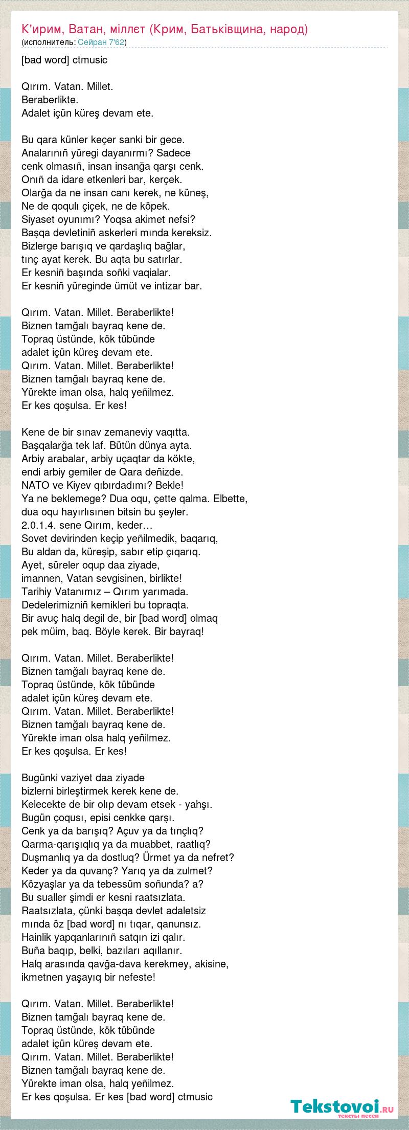 [bad word] ctmusic Qırım. Vatan. Millet. Beraberlikte. Adalet içün küreş devam ete. Bu qara künler keçer sanki bir gece. Analarınıñ yüregi dayanırmı? Sadece cenk olmasıñ, insan insanğa qarşı cenk. Onıñ da idare etkenleri bar, kerçek. Olarğa da ne insan canı kerek, ne küneş, Ne de qoqulı çiçek, ne de köpek. Siyaset oyunımı? Yoqsa akimet nefsi? Başqa devletiniñ askerleri mında kereksiz. Bizlerge barışıq ve qardaşlıq bağlar, tınç ayat kerek. Bu aqta bu satırlar. Er kesniñ başında soñki vaqialar. Er kesniñ yüreginde ümüt ve intizar bar. Qırım. Vatan. Millet. Beraberlikte! Biznen tamğalı bayraq kene de. Topraq üstünde, kök tübünde adalet içün küreş devam ete. Qırım. Vatan. Millet. Beraberlikte! Biznen tamğalı bayraq kene de. Yürekte iman olsa, halq yeñilmez. Er kes qoşulsa. Er kes! Kene de bir sınav zemaneviy vaqıtta. Başqalarğa tek laf. Bütün dünya ayta. Arbiy arabalar, arbiy uçaqtar da kökte, endi arbiy gemiler de Qara deñizde. NATO ve Kiyev qıbırdadımı? Bekle! Ya ne beklemege? Dua oqu, çette qalma. Elbette, dua oqu hayırlısınen bitsin bu şeyler. 2.0.1.4. sene Qırım, keder… Sovet devirinden keçip yeñilmedik, baqarıq, Bu aldan da, küreşip, sabır etip çıqarıq. Ayet, süreler oqup daa ziyade, imannen, Vatan sevgisinen, birlikte! Tarihiy Vatanımız – Qırım yarımada. Dedelerimizniñ kemikleri bu topraqta. Bir avuç halq degil de, bir yumruq olmaq pek müim, baq. Böyle kerek. Bir bayraq! Qırım. Vatan. Millet. Beraberlikte! Biznen tamğalı bayraq kene de. Topraq üstünde, kök tübünde adalet içün küreş devam ete. Qırım. Vatan. Millet. Beraberlikte! Biznen tamğalı bayraq kene de. Yürekte iman olsa halq yeñilmez. Er kes qoşulsa. Er kes! Bugünki vaziyet daa ziyade bizlerni birleştirmek kerek kene de. Kelecekte de bir olıp devam etsek - yahşı. Bugün çoqusı, episi cenkke qarşı. Cenk ya da barışıq? Açuv ya da tınçlıq? Qarma-qarışıqlıq ya da muabbet, raatlıq? Duşmanlıq ya da dostluq? Ürmet ya da nefret? Keder ya da quvanç? Yarıq ya da zulmet? Közyaşlar ya da tebessüm soñunda? a? Bu sualler şimdi er kesni raatsızlata. Raatsızlata, çünki başqa devlet adaletsiz mında öz burunını tıqar, qanunsız. Hainlik yapqanlarınıñ satqın izi qalır. Buña baqıp, belki, bazıları aqıllanır. Halq arasında qavğa-dava kerekmey, akisine, ikmetnen yaşayıq bir nefeste! Qırım. Vatan. Millet. Beraberlikte! Biznen tamğalı bayraq kene de. Topraq üstünde, kök tübünde adalet içün küreş devam ete. Qırım. Vatan. Millet. Beraberlikte! Biznen tamğalı bayraq kene de. Yürekte iman olsa, halq yeñilmez. Er kes qoşulsa. Er kes [bad word] ctmusic