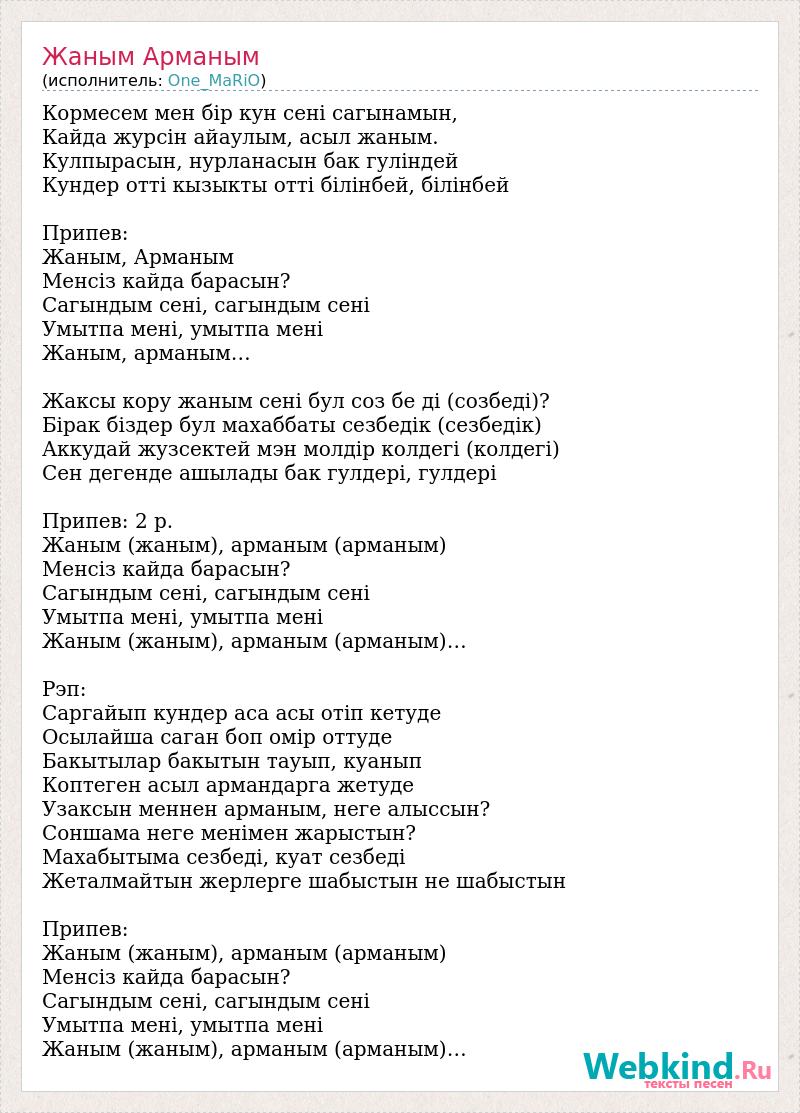 Кормесем мен бiр кун сенi сагынамын, Кайда журсiн айаулым, асыл жаным. Кулпырасын, нурланасын бак гулiндей Кундер оттi кызыкты оттi бiлiнбей, бiлiнбей Припев: Жаным, Арманым Менсiз кайда барасын? Сагындым сенi, сагындым сенi Умытпа менi, умытпа менi Жаным, арманым… Жаксы кору жаным сенi бул соз бе дi (созбедi)? Бiрак бiздер бул махаббаты сезбедiк (сезбедiк) Аккудай жузсектей мэн молдiр колдегi (колдегi) Cен дегенде ашылады бак гулдерi, гулдерi Припев: 2 р. Жаным (жаным), арманым (арманым) Менсiз кайда барасын? Сагындым сенi, сагындым сенi Умытпа менi, умытпа менi Жаным (жаным), арманым (арманым)… Рэп: Саргайып кундер аса асы отiп кетуде Осылайша саган боп омiр оттуде Бакытылар бакытын тауып, куанып Коптеген асыл армандарга жетуде Узаксын меннен арманым, неге алыссын? Соншама неге менiмен жарыстын? Махабытыма сезбедi, куат сезбедi Жеталмайтын жерлерге шабыстын не шабыстын Припев: Жаным (жаным), арманым (арманым) Менсiз кайда барасын? Сагындым сенi, сагындым сенi Умытпа менi, умытпа менi Жаным (жаным), арманым (арманым)…