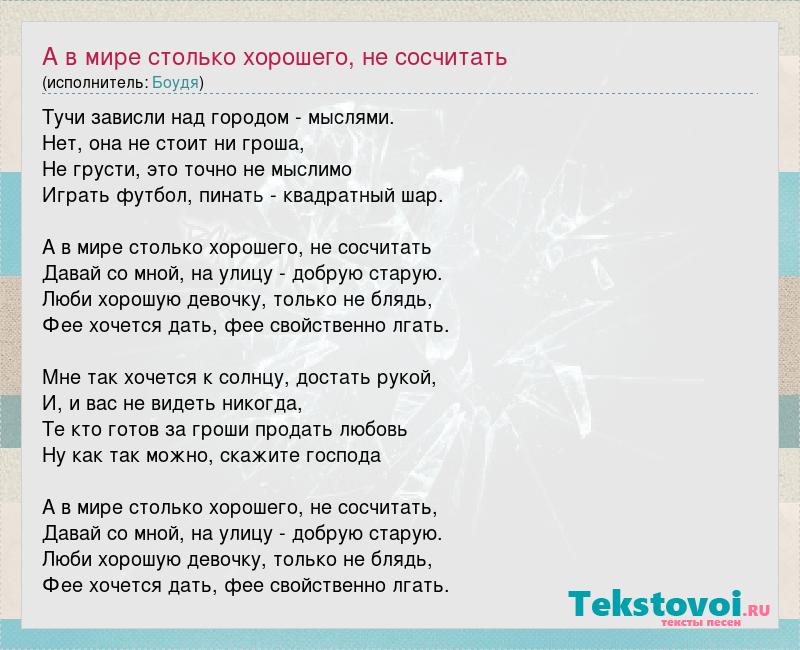Тучи зависли над городом - мыслями. Нет, она не стоит ни гроша, Не грусти, это точно не мыслимо Играть футбол, пинать - квадратный шар. А в мире столько хорошего, не сосчитать Давай со мной, на улицу - добрую старую. Люби хорошую девочку, только не блядь, Фее хочется дать, фее свойственно лгать. Мне так хочется к солнцу, достать рукой, И, и вас не видеть никогда, Те кто готов за гроши продать любовь Ну как так можно, скажите господа А в мире столько хорошего, не сосчитать, Давай со мной, на улицу - добрую старую. Люби хорошую девочку, только не блядь, Фее хочется дать, фее свойственно лгать.