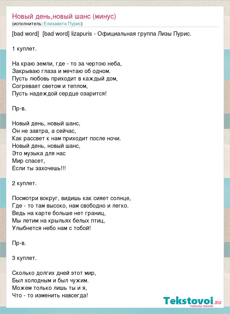 [bad word] [bad word] lizapuris - Официальная группа Лизы Пурис. 1 куплет. На краю земли, где - то за чертою неба, Закрываю глаза и мечтаю об одном. Пусть любовь приходит в каждый дом, Согревает светом и теплом, Пусть надеждой сердце озарится! Пр-в. Новый день, новый шанс, Он не завтра, а сейчас, Как рассвет к нам приходит после ночи. Новый день, новый шанс, Это музыка для нас Мир спасет, Если ты захочешь!!! 2 куплет. Посмотри вокруг, видишь как сияет солнце, Где - то там высоко, нам свободно и легко. Ведь на карте больше нет границ, Мы летим на крыльях белых птиц, Улыбнется небо нам с тобой! Пр-в. 3 куплет. Сколько долгих дней этот мир, Был холодным и был чужим. Можем только лишь ты и я, Что - то изменить навсегда!