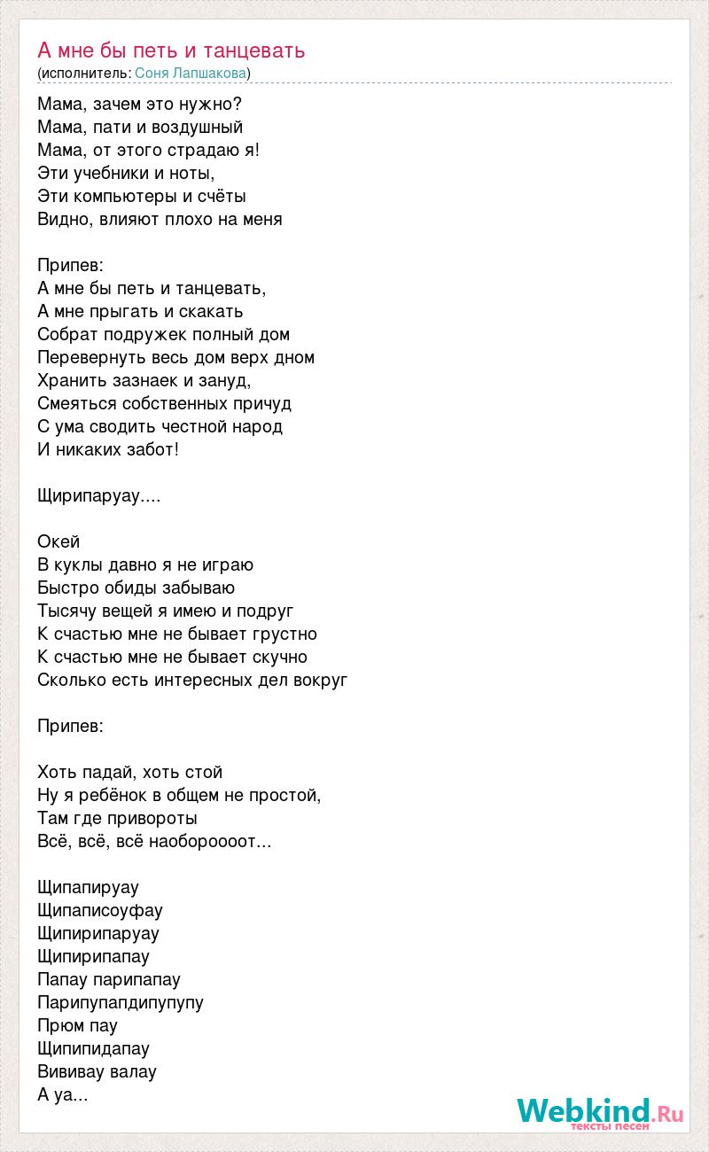 Мама, зачем это нужно? Мама, пати и воздушный Мама, от этого страдаю я! Эти учебники и ноты, Эти компьютеры и счёты Видно, влияют плохо на меня Припев: А мне бы петь и танцевать, А мне прыгать и скакать Собрат подружек полный дом Перевернуть весь дом верх дном Хранить зазнаек и зануд, Смеяться собственных причуд С ума сводить честной народ И никаких забот! Щирипаруау.... Окей В куклы давно я не играю Быстро обиды забываю Тысячу вещей я имею и подруг К счастью мне не бывает грустно К счастью мне не бывает скучно Сколько есть интересных дел вокруг Припев: Хоть падай, хоть стой Ну я ребёнок в общем не простой, Там где привороты Всё, всё, всё наобороооот... Щипапируау Щипаписоуфау Щипирипаруау Щипирипапау Папау парипапау Парипупапдипупупу Прюм пау Щипипидапау Вививау валау А уа...