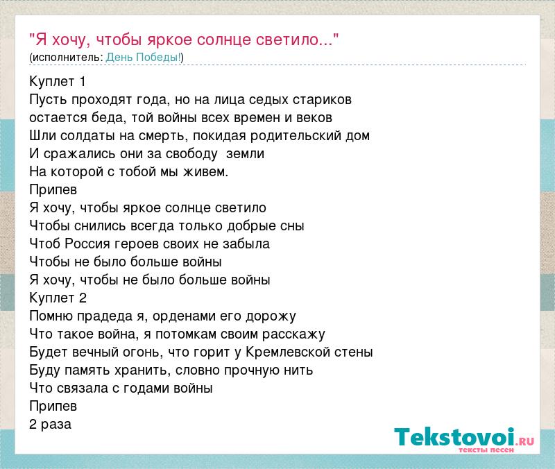 Куплет 1 Пусть проходят года, но на лица седых стариков остается беда, той войны всех времен и веков Шли солдаты на смерть, покидая родительский дом И сражались они за свободу земли На которой с тобой мы живем. Припев Я хочу, чтобы яркое солнце светило Чтобы снились всегда только добрые сны Чтоб Россия героев своих не забыла Чтобы не было больше войны Я хочу, чтобы не было больше войны Куплет 2 Помню прадеда я, орденами его дорожу Что такое война, я потомкам своим расскажу Будет вечный огонь, что горит у Кремлевской стены Буду память хранить, словно прочную нить Что связала с годами войны Припев 2 раза