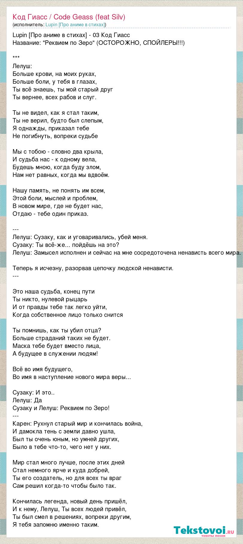 Lupin [Про аниме в стихах] - 03 Код Гиасс Название: "Реквием по Зеро" (ОСТОРОЖНО, СПОЙЛЕРЫ!!!) *** Лелуш: Больше крови, на моих руках, Больше боли, у тебя в глазах, Ты всё знаешь, ты мой старый друг Ты вернее, всех рабов и слуг. Ты не видел, как я стал таким, Ты не верил, будто был слепым, Я однажды, приказал тебе Не погибнуть, вопреки судьбе Мы с тобою - словно два крыла, И судьба нас - к одному вела, Будешь мною, когда буду злом, Нам нет равных, когда мы вдвоём. Нашу память, не понять им всем, Этой боли, мыслей и проблем, В новом мире, где не будет нас, Отдаю - тебе один приказ. --- Лелуш: Сузаку, как и уговаривались, убей меня. Сузаку: Ты всё-же... пойдёшь на это? Лелуш: Замысел исполнен и сейчас на мне сосредоточена ненависть всего мира. Теперь я исчезну, разорвав цепочку людской ненависти. --- Это наша судьба, конец пути Ты никто, нулевой рыцарь И от правды тебе так легко уйти, Когда собственное лицо только снится Ты помнишь, как ты убил отца? Больше страданий таких не будет. Маска тебе будет вместо лица, А будущее в служении людям! Всё во имя будущего, Во имя в наступление нового мира веры... Сузаку: И это.. Лелуш: Да Сузаку и Лелуш: Реквием по Зеро! --- Карен: Рухнул старый мир и кончилась война, И дамокла тень с земли давно ушла, Был ты очень юным, но умней других, Было в тебе что-то, чего нет у них. Мир стал много лучше, после этих дней Стал немного ярче и куда добрей, Ты его создатель, но для всех ты враг Сам решил когда-то чтобы было так. Кончилась легенда, новый день пришёл, И к нему, Лелуш, Ты всех людей привёл, Ты был смел в решениях, вопреки другим, Я тебя запомню именно таким.