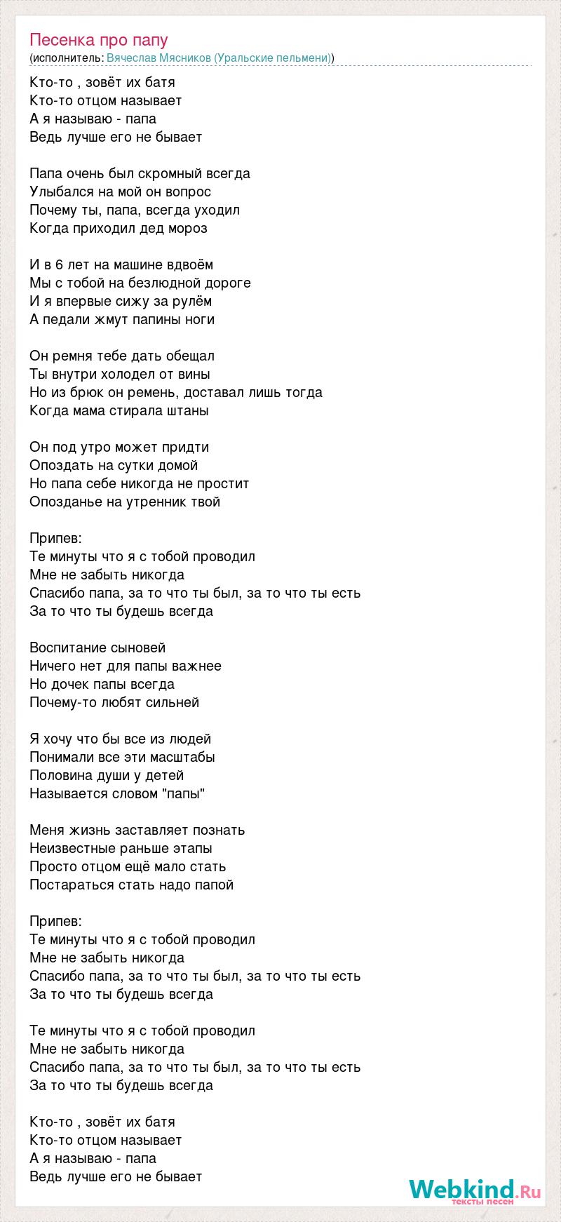 Кто-то , зовёт их батя Кто-то отцом называет А я называю - папа Ведь лучше его не бывает Папа очень был скромный всегда Улыбался на мой он вопрос Почему ты, папа, всегда уходил Когда приходил дед мороз И в 6 лет на машине вдвоём Мы с тобой на безлюдной дороге И я впервые сижу за рулём А педали жмут папины ноги Он ремня тебе дать обещал Ты внутри холодел от вины Но из брюк он ремень, доставал лишь тогда Когда мама стирала штаны Он под утро может придти Опоздать на сутки домой Но папа себе никогда не простит Опозданье на утренник твой Припев: Те минуты что я с тобой проводил Мне не забыть никогда Спасибо папа, за то что ты был, за то что ты есть За то что ты будешь всегда Воспитание сыновей Ничего нет для папы важнее Но дочек папы всегда Почему-то любят сильней Я хочу что бы все из людей Понимали все эти масштабы Половина души у детей Называется словом "папы" Меня жизнь заставляет познать Неизвестные раньше этапы Просто отцом ещё мало стать Постараться стать надо папой Припев: Те минуты что я с тобой проводил Мне не забыть никогда Спасибо папа, за то что ты был, за то что ты есть За то что ты будешь всегда Те минуты что я с тобой проводил Мне не забыть никогда Спасибо папа, за то что ты был, за то что ты есть За то что ты будешь всегда Кто-то , зовёт их батя Кто-то отцом называет А я называю - папа Ведь лучше его не бывает