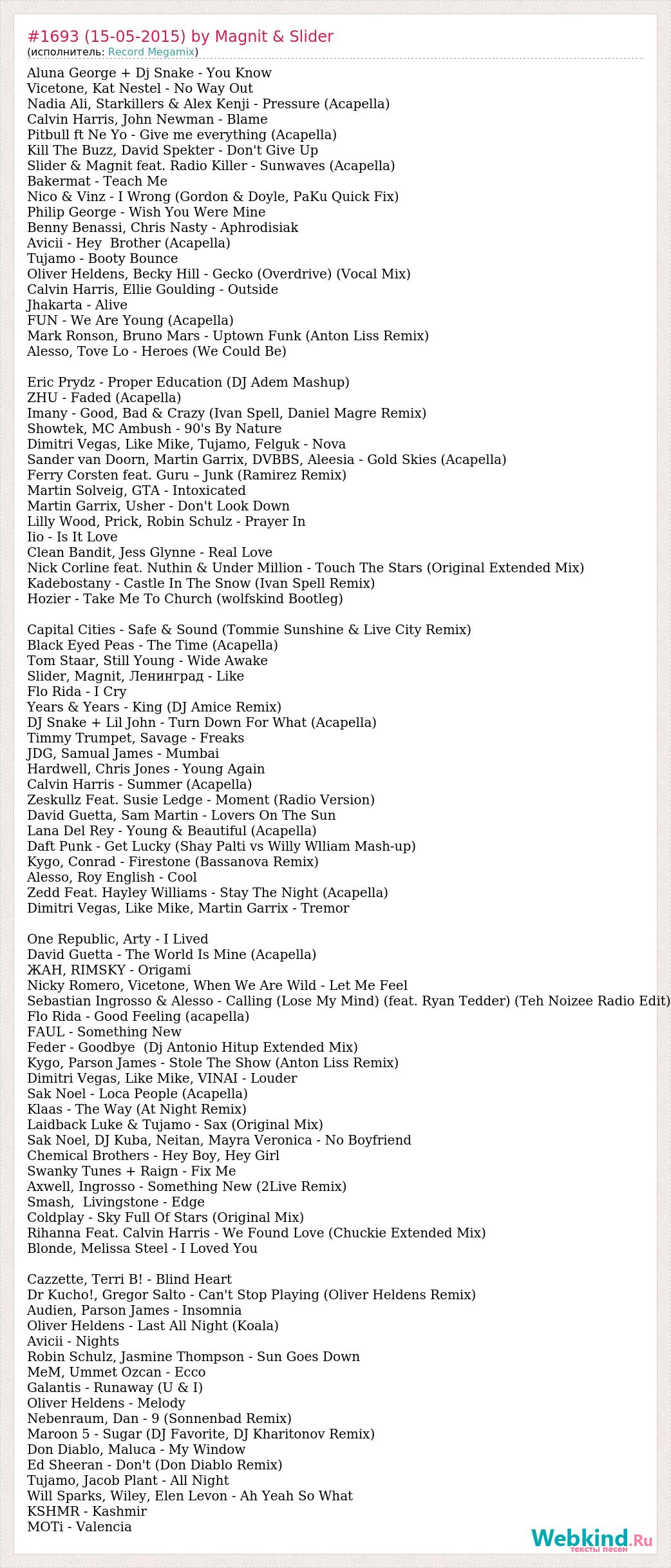 Aluna George + Dj Snake - You Know Vicetone, Kat Nestel - No Way Out Nadia Ali, Starkillers & Alex Kenji - Pressure (Acapella) Calvin Harris, John Newman - Blame Pitbull ft Ne Yo - Give me everything (Acapella) Kill The Buzz, David Spekter - Don't Give Up Slider & Magnit feat. Radio Killer - Sunwaves (Acapella) Bakermat - Teach Me Nico & Vinz - I Wrong (Gordon & Doyle, PaKu Quick Fix) Philip George - Wish You Were Mine Benny Benassi, Chris Nasty - Aphrodisiak Avicii - Hey Brother (Acapella) Tujamo - Booty Bounce Oliver Heldens, Becky Hill - Gecko (Overdrive) (Vocal Mix) Calvin Harris, Ellie Goulding - Outside Jhakarta - Alive FUN - We Are Young (Acapella) Mark Ronson, Bruno Mars - Uptown Funk (Anton Liss Remix) Alesso, Tove Lo - Heroes (We Could Be) Eric Prydz - Proper Education (DJ Adem Mashup) ZHU - Faded (Acapella) Imany - Good, Bad & Crazy (Ivan Spell, Daniel Magre Remix) Showtek, MC Ambush - 90's By Nature Dimitri Vegas, Like Mike, Tujamo, Felguk - Nova Sander van Doorn, Martin Garrix, DVBBS, Aleesia - Gold Skies (Acapella) Ferry Corsten feat. Guru – Junk (Ramirez Remix) Martin Solveig, GTA - Intoxicated Martin Garrix, Usher - Don't Look Down Lilly Wood, Prick, Robin Schulz - Prayer In Iio - Is It Love Clean Bandit, Jess Glynne - Real Love Nick Corline feat. Nuthin & Under Million - Touch The Stars (Original Extended Mix) Kadebostany - Castle In The Snow (Ivan Spell Remix) Hozier - Take Me To Church (wolfskind Bootleg) Capital Cities - Safe & Sound (Tommie Sunshine & Live City Remix) Black Eyed Peas - The Time (Acapella) Tom Staar, Still Young - Wide Awake Slider, Magnit, Ленинград - Like Flo Rida - I Cry Years & Years - King (DJ Amice Remix) DJ Snake + Lil John - Turn Down For What (Acapella) Timmy Trumpet, Savage - Freaks JDG, Samual James - Mumbai Hardwell, Chris Jones - Young Again Calvin Harris - Summer (Acapella) Zeskullz Feat. Susie Ledge - Moment (Radio Version) David Guetta, Sam Martin - Lovers On The Sun Lana Del Rey - Young & Beautiful (Acapella) Daft Punk - Get Lucky (Shay Palti vs Willy Wlliam Mash-up) Kygo, Conrad - Firestone (Bassanova Remix) Alesso, Roy English - Cool Zedd Feat. Hayley Williams - Stay The Night (Acapella) Dimitri Vegas, Like Mike, Martin Garrix - Tremor One Republic, Arty - I Lived David Guetta - The World Is Mine (Acapella) ЖАН, RIMSKY - Origami Nicky Romero, Vicetone, When We Are Wild - Let Me Feel Sebastian Ingrosso & Alesso - Calling (Lose My Mind) (feat. Ryan Tedder) (Teh Noizee Radio Edit) Flo Rida - Good Feeling (acapella) FAUL - Something New Feder - Goodbye (Dj Antonio Hitup Extended Mix) Kygo, Parson James - Stole The Show (Anton Liss Remix) Dimitri Vegas, Like Mike, VINAI - Louder Sak Noel - Loca People (Acapella) Klaas - The Way (At Night Remix) Laidback Luke & Tujamo - Sax (Original Mix) Sak Noel, DJ Kuba, Neitan, Mayra Veronica - No Boyfriend Chemical Brothers - Hey Boy, Hey Girl Swanky Tunes + Raign - Fix Me Axwell, Ingrosso - Something New (2Live Remix) Smash, Livingstone - Edge Coldplay - Sky Full Of Stars (Original Mix) Rihanna Feat. Calvin Harris - We Found Love (Chuckie Extended Mix) Blonde, Melissa Steel - I Loved You Cazzette, Terri B! - Blind Heart Dr Kucho!, Gregor Salto - Can't Stop Playing (Oliver Heldens Remix) Audien, Parson James - Insomnia Oliver Heldens - Last All Night (Koala) Avicii - Nights Robin Schulz, Jasmine Thompson - Sun Goes Down MeM, Ummet Ozcan - Ecco Galantis - Runaway (U & I) Oliver Heldens - Melody Nebenraum, Dan - 9 (Sonnenbad Remix) Maroon 5 - Sugar (DJ Favorite, DJ Kharitonov Remix) Don Diablo, Maluca - My Window Ed Sheeran - Don't (Don Diablo Remix) Tujamo, Jacob Plant - All Night Will Sparks, Wiley, Elen Levon - Ah Yeah So What KSHMR - Kashmir MOTi - Valencia