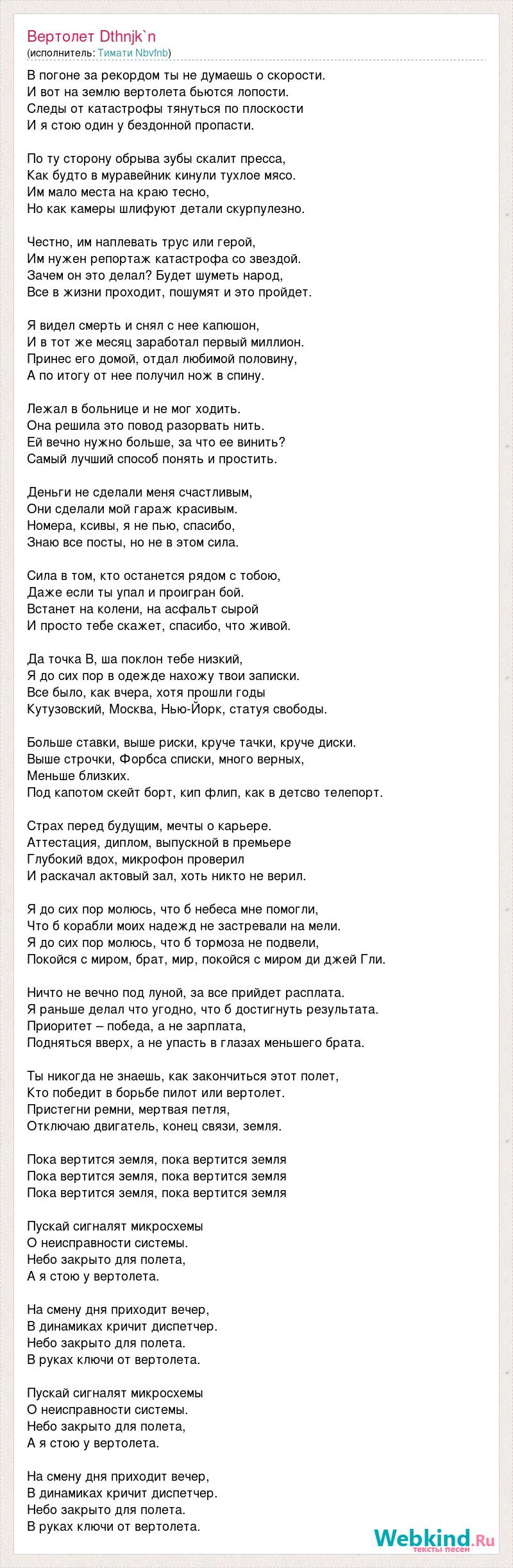 В погоне за рекордом ты не думаешь о скорости. И вот на землю вертолета бьются лопости. Следы от катастрофы тянуться по плоскости И я стою один у бездонной пропасти. По ту сторону обрыва зубы скалит пресса, Как будто в муравейник кинули тухлое мясо. Им мало места на краю тесно, Но как камеры шлифуют детали скурпулезно. Честно, им наплевать трус или герой, Им нужен репортаж катастрофа со звездой. Зачем он это делал? Будет шуметь народ, Все в жизни проходит, пошумят и это пройдет. Я видел смерть и снял с нее капюшон, И в тот же месяц заработал первый миллион. Принес его домой, отдал любимой половину, А по итогу от нее получил нож в спину. Лежал в больнице и не мог ходить. Она решила это повод разорвать нить. Ей вечно нужно больше, за что ее винить? Самый лучший способ понять и простить. Деньги не сделали меня счастливым, Они сделали мой гараж красивым. Номера, ксивы, я не пью, спасибо, Знаю все посты, но не в этом сила. Сила в том, кто останется рядом с тобою, Даже если ты упал и проигран бой. Встанет на колени, на асфальт сырой И просто тебе скажет, спасибо, что живой. Да точка В, ша поклон тебе низкий, Я до сих пор в одежде нахожу твои записки. Все было, как вчера, хотя прошли годы Кутузовский, Москва, Нью-Йорк, статуя свободы. Больше ставки, выше риски, круче тачки, круче диски. Выше строчки, Форбса списки, много верных, Меньше близких. Под капотом скейт борт, кип флип, как в детсво телепорт. Страх перед будущим, мечты о карьере. Аттестация, диплом, выпускной в премьере Глубокий вдох, микрофон проверил И раскачал актовый зал, хоть никто не верил. Я до сих пор молюсь, что б небеса мне помогли, Что б корабли моих надежд не застревали на мели. Я до сих пор молюсь, что б тормоза не подвели, Покойся с миром, брат, мир, покойся с миром ди джей Гли. Ничто не вечно под луной, за все прийдет расплата. Я раньше делал что угодно, что б достигнуть результата. Приоритет – победа, а не зарплата, Подняться вверх, а не упасть в глазах меньшего брата. Ты никогда не знаешь, как закончиться этот полет, Кто победит в борьбе пилот или вертолет. Пристегни ремни, мертвая петля, Отключаю двигатель, конец связи, земля. Пока вертится земля, пока вертится земля Пока вертится земля, пока вертится земля Пока вертится земля, пока вертится земля Пускай сигналят микросхемы О неисправности системы. Небо закрыто для полета, А я стою у вертолета. На смену дня приходит вечер, В динамиках кричит диспетчер. Небо закрыто для полета. В руках ключи от вертолета. Пускай сигналят микросхемы О неисправности системы. Небо закрыто для полета, А я стою у вертолета. На смену дня приходит вечер, В динамиках кричит диспетчер. Небо закрыто для полета. В руках ключи от вертолета.