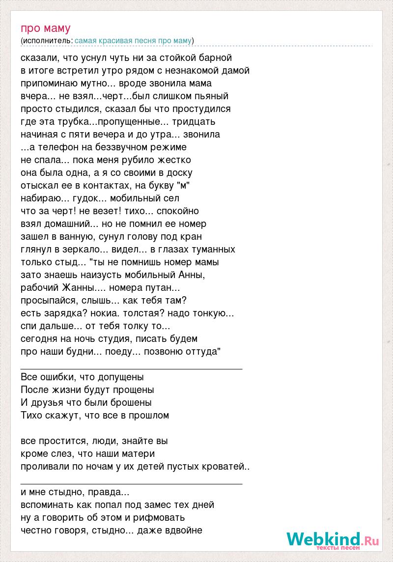 сказали, что уснул чуть ни за стойкой барной в итоге встретил утро рядом с незнакомой дамой припоминаю мутно... вроде звонила мама вчера... не взял...черт...был слишком пьяный просто стыдился, сказал бы что простудился где эта трубка...пропущенные... тридцать начиная с пяти вечера и до утра... звонила ...а телефон на беззвучном режиме не спала... пока меня рубило жестко она была одна, а я со своими в доску отыскал ее в контактах, на букву "м" набираю... гудок... мобильный сел что за черт! не везет! тихо... спокойно взял домашний... но не помнил ее номер зашел в ванную, сунул голову под кран глянул в зеркало... видел... в глазах туманных только стыд... "ты не помнишь номер мамы зато знаешь наизусть мобильный Анны, рабочий Жанны.... номера путан... просыпайся, слышь... как тебя там? есть зарядка? нокиа. толстая? надо тонкую... спи дальше... от тебя толку то... сегодня на ночь студия, писать будем про наши будни... поеду... позвоню оттуда" _________________________________________ Все ошибки, что допущены После жизни будут прощены И друзья что были брошены Тихо скажут, что все в прошлом все простится, люди, знайте вы кроме слез, что наши матери проливали по ночам у их детей пустых кроватей.. _________________________________________ и мне стыдно, правда... вспоминать как попал под замес тех дней ну а говорить об этом и рифмовать честно говоря, стыдно... даже вдвойне