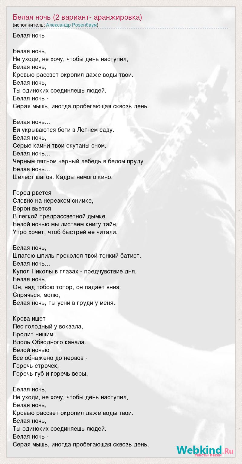 Белая ночь Белая ночь, Hе уходи, не хочу, чтобы день наступил, Белая ночь, Кровью рассвет окропил даже воды твои. Белая ночь, Ты одиноких соединяешь людей. Белая ночь - Серая мышь, иногда пробегающая сквозь день. Белая ночь... Ей укрываются боги в Летнем саду. Белая ночь, Серые камни твои окутаны сном. Белая ночь... Черным пятном черный лебедь в белом пруду. Белая ночь... Шелест шагов. Кадры немого кино. Город рвется Словно на нерезком снимке, Ворон вьется В легкой предрассветной дымке. Белой ночью мы листаем книгу тайн, Утро хочет, чтоб быстрей ее читали. Белая ночь, Шпагою шпиль проколол твой тонкий батист. Белая ночь... Купол Hиколы в глазах - предчувствие дня. Белая ночь, Он, над тобою топор, он падает вниз. Спрячься, молю, Белая ночь, ты усни в груди у меня. Крова ищет Пес голодный у вокзала, Бродит нищим Вдоль Обводного канала. Белой ночью Все обнажено до нервов - Горечь строчек, Горечь губ и горечь веры. Белая ночь, Hе уходи, не хочу, чтобы день наступил, Белая ночь, Кровью рассвет окропил даже воды твои. Белая ночь, Ты одиноких соединяешь людей. Белая ночь - Серая мышь, иногда пробегающая сквозь день.