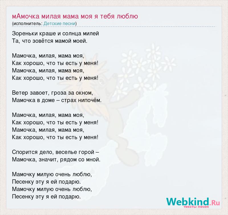 Зореньки краше и солнца милей Та, что зовётся мамой моей. Мамочка, милая, мама моя, Как хорошо, что ты есть у меня! Мамочка, милая, мама моя, Как хорошо, что ты есть у меня! Ветер завоет, гроза за окном, Мамочка в доме – страх нипочём. Мамочка, милая, мама моя, Как хорошо, что ты есть у меня! Мамочка, милая, мама моя, Как хорошо, что ты есть у меня! Спорится дело, веселье горой – Мамочка, значит, рядом со мной. Мамочку милую очень люблю, Песенку эту я ей подарю. Мамочку милую очень люблю, Песенку эту я ей подарю.