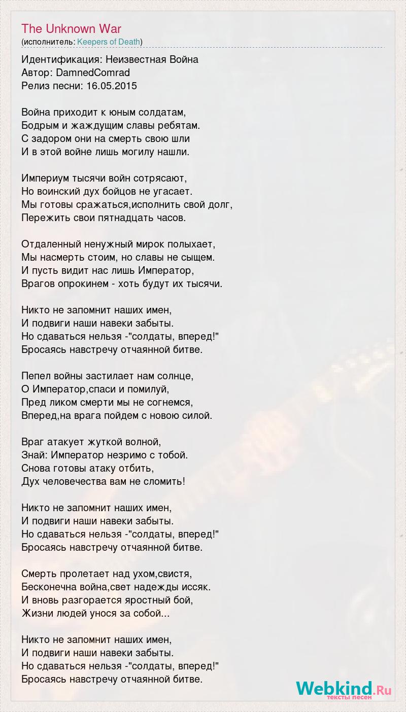 Идентификация: Неизвестная Война Автор: DamnedComrad Релиз песни: 16.05.2015 Война приходит к юным солдатам, Бодрым и жаждущим славы ребятам. С задором они на смерть свою шли И в этой войне лишь могилу нашли. Империум тысячи войн сотрясают, Но воинский дух бойцов не угасает. Мы готовы сражаться,исполнить свой долг, Пережить свои пятнадцать часов. Отдаленный ненужный мирок полыхает, Мы насмерть стоим, но славы не сыщем. И пусть видит нас лишь Император, Врагов опрокинем - хоть будут их тысячи. Никто не запомнит наших имен, И подвиги наши навеки забыты. Но сдаваться нельзя -"солдаты, вперед!" Бросаясь навстречу отчаянной битве. Пепел войны застилает нам солнце, О Император,спаси и помилуй, Пред ликом смерти мы не согнемся, Вперед,на врага пойдем с новою силой. Враг атакует жуткой волной, Знай: Император незримо с тобой. Снова готовы атаку отбить, Дух человечества вам не сломить! Никто не запомнит наших имен, И подвиги наши навеки забыты. Но сдаваться нельзя -"солдаты, вперед!" Бросаясь навстречу отчаянной битве. Смерть пролетает над ухом,свистя, Бесконечна война,свет надежды иссяк. И вновь разгорается яростный бой, Жизни людей унося за собой... Никто не запомнит наших имен, И подвиги наши навеки забыты. Но сдаваться нельзя -"солдаты, вперед!" Бросаясь навстречу отчаянной битве.