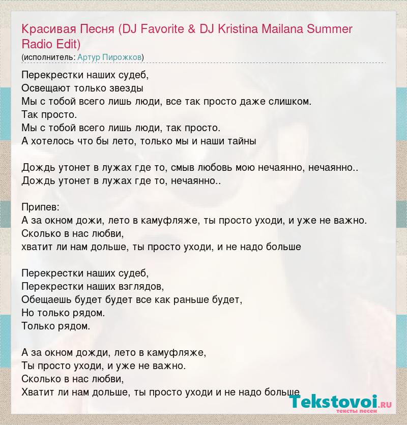 Главная→Исполнители→Артур Пирожков→Красивая Песня (DJ Favorite & DJ Kristina Mailana Summer Radio Edit)