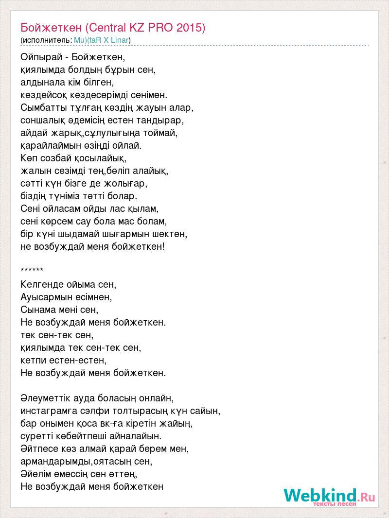 Ойпырай - Бойжеткен, қиялымда болдың бұрын сен, алдынала кім білген, кездейсоқ кездесерімді сенімен. Сымбатты тұлғаң көздің жауын алар, соншалық әдемісің естен тандырар, айдай жарық,сұлулығыңа тоймай, қарайлаймын өзіңді ойлай. Көп созбай қосылайық, жалын сезімді тең,бөліп алайық, сәтті күн бізге де жолығар, біздің түніміз тәтті болар. Сені ойласам ойды лас қылам, сені көрсем сау бола мас болам, бір күні шыдамай шығармын шектен, не возбуждай меня бойжеткен! ****** Келгенде ойыма сен, Ауысармын есімнен, Сынама мені сен, Не возбуждай меня бойжеткен. тек сен-тек сен, қиялымда тек сен-тек сен, кетпи естен-естен, Не возбуждай меня бойжеткен. Әлеуметтік ауда боласың онлайн, инстаграмға сэлфи толтырасың күн сайын, бар онымен қоса вк-ға кіретін жайың, суретті көбейтпеші айналайын. Әйтпесе көз алмай қарай берем мен, армандарымды,оятасың сен, Әйелім емессің сен әттең, Не возбуждай меня бойжеткен