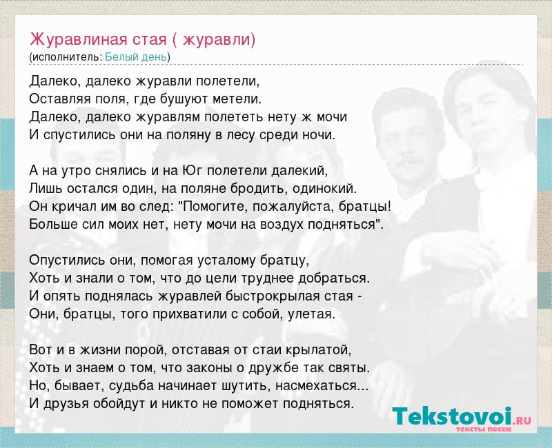 Далеко, далеко журавли полетели, Оставляя поля, где бушуют метели. Далеко, далеко журавлям полететь нету ж мочи И спустились они на поляну в лесу среди ночи. А на утро снялись и на Юг полетели далекий, Лишь остался один, на поляне бродить, одинокий. Он кричал им во след: "Помогите, пожалуйста, братцы! Больше сил моих нет, нету мочи на воздух подняться". Опустились они, помогая усталому братцу, Хоть и знали о том, что до цели труднее добраться. И опять поднялась журавлей быстрокрылая стая - Они, братцы, того прихватили с собой, улетая. Вот и в жизни порой, отставая от стаи крылатой, Хоть и знаем о том, что законы о дружбе так святы. Но, бывает, судьба начинает шутить, насмехаться... И друзья обойдут и никто не поможет подняться.