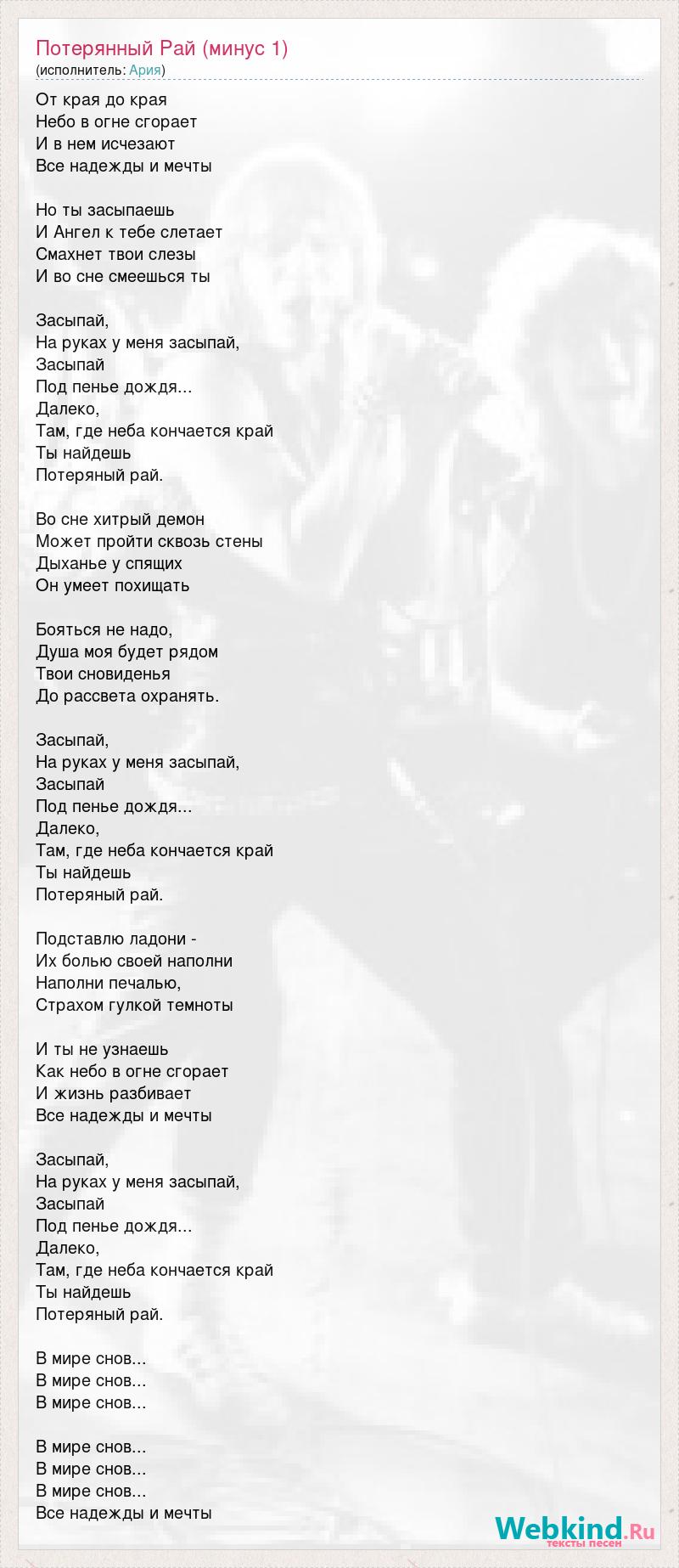 От края до края Небо в огне сгорает И в нем исчезают Все надежды и мечты Но ты засыпаешь И Ангел к тебе слетает Смахнет твои слезы И во сне смеешься ты Засыпай, На руках у меня засыпай, Засыпай Под пенье дождя... Далеко, Там, где неба кончается край Ты найдешь Потеряный рай. Во сне хитрый демон Может пройти сквозь стены Дыханье у спящих Он умеет похищать Бояться не надо, Душа моя будет рядом Твои сновиденья До рассвета охранять. Засыпай, На руках у меня засыпай, Засыпай Под пенье дождя... Далеко, Там, где неба кончается край Ты найдешь Потеряный рай. Подставлю ладони - Их болью своей наполни Наполни печалью, Cтрахом гулкой темноты И ты не узнаешь Как небо в огне сгорает И жизнь разбивает Все надежды и мечты Засыпай, На руках у меня засыпай, Засыпай Под пенье дождя... Далеко, Там, где неба кончается край Ты найдешь Потеряный рай. В мире снов... В мире снов... В мире снов... В мире снов... В мире снов... В мире снов... Все надежды и мечты