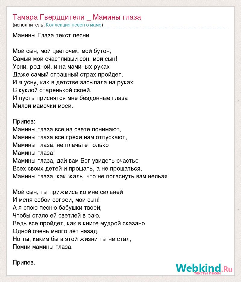 Мамины Глаза текст песни Мой сын, мой цветочек, мой бутон, Самый мой счастливый сон, мой сын! Усни, родной, и на маминых руках Даже самый страшный страх пройдет. И я усну, как в детстве засыпала на руках С куклой старенькой своей. И пусть приснятся мне бездонные глаза Милой мамочки моей. Припев: Мамины глаза все на свете понимают, Мамины глаза все грехи нам отпускают, Мамины глаза, не плачьте только Мамины глаза! Мамины глаза, дай вам Бог увидеть счастье Всех своих детей и прощать, а не прощаться, Мамины глаза, как жаль, что не погаснуть вам нельзя. Мой сын, ты прижмись ко мне сильней И меня собой согрей, мой сын! А я спою песню бабушки твоей, Чтобы стало ей светлей в раю. Ведь все пройдет, как в книге мудрой сказано Одной очень много лет назад, Но ты, каким бы в этой жизни ты не стал, Помни мамины глаза. Припев.
