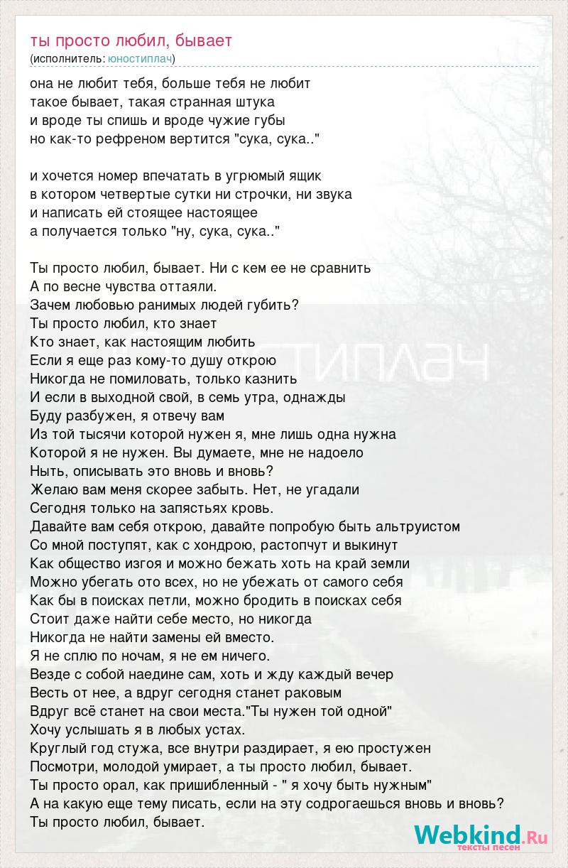 она не любит тебя, больше тебя не любит такое бывает, такая странная штука и вроде ты спишь и вроде чужие губы но как-то рефреном вертится "сука, сука.." и хочется номер впечатать в угрюмый ящик в котором четвертые сутки ни строчки, ни звука и написать ей стоящее настоящее а получается только "ну, сука, сука.." Ты просто любил, бывает. Ни с кем ее не сравнить А по весне чувства оттаяли. Зачем любовью ранимых людей губить? Ты просто любил, кто знает Кто знает, как настоящим любить Если я еще раз кому-то душу открою Никогда не помиловать, только казнить И если в выходной свой, в семь утра, однажды Буду разбужен, я отвечу вам Из той тысячи которой нужен я, мне лишь одна нужна Которой я не нужен. Вы думаете, мне не надоело Ныть, описывать это вновь и вновь? Желаю вам меня скорее забыть. Нет, не угадали Сегодня только на запястьях кровь. Давайте вам себя открою, давайте попробую быть альтруистом Со мной поступят, как с хондрою, растопчут и выкинут Как общество изгоя и можно бежать хоть на край земли Можно убегать ото всех, но не убежать от самого себя Как бы в поисках петли, можно бродить в поисках себя Стоит даже найти себе место, но никогда Никогда не найти замены ей вместо. Я не сплю по ночам, я не ем ничего. Везде с собой наедине сам, хоть и жду каждый вечер Весть от нее, а вдруг сегодня станет раковым Вдруг всё станет на свои места."Ты нужен той одной" Хочу услышать я в любых устах. Круглый год стужа, все внутри раздирает, я ею простужен Посмотри, молодой умирает, а ты просто любил, бывает. Ты просто орал, как пришибленный - " я хочу быть нужным" А на какую еще тему писать, если на эту содрогаешься вновь и вновь? Ты просто любил, бывает.