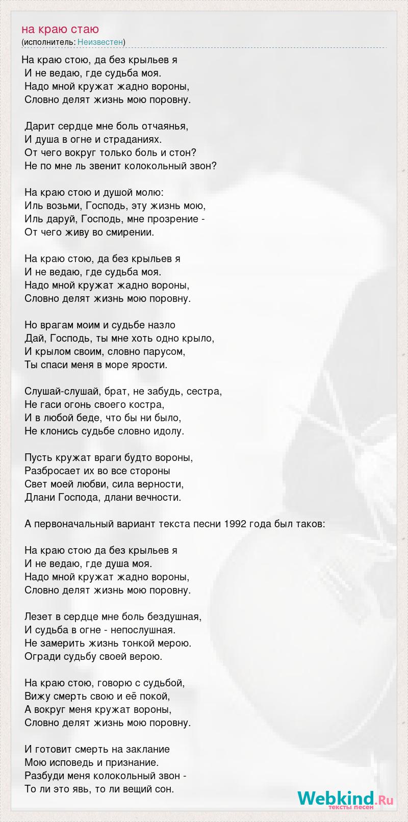 На краю стою, да без крыльев я И не ведаю, где судьба моя. Надо мной кружат жадно вороны, Словно делят жизнь мою поровну. Дарит сердце мне боль отчаянья, И душа в огне и страданиях. От чего вокруг только боль и стон? Не по мне ль звенит колокольный звон? На краю стою и душой молю: Иль возьми, Господь, эту жизнь мою, Иль даруй, Господь, мне прозрение - От чего живу во смирении. На краю стою, да без крыльев я И не ведаю, где судьба моя. Надо мной кружат жадно вороны, Словно делят жизнь мою поровну. Но врагам моим и судьбе назло Дай, Господь, ты мне хоть одно крыло, И крылом своим, словно парусом, Ты спаси меня в море ярости. Слушай-слушай, брат, не забудь, сестра, Не гаси огонь своего костра, И в любой беде, что бы ни было, Не клонись судьбе словно идолу. Пусть кружат враги будто вороны, Разбросает их во все стороны Свет моей любви, сила верности, Длани Господа, длани вечности. А первоначальный вариант текста песни 1992 года был таков: На краю стою да без крыльев я И не ведаю, где душа моя. Надо мной кружат жадно вороны, Словно делят жизнь мою поровну. Лезет в сердце мне боль бездушная, И судьба в огне - непослушная. Не замерить жизнь тонкой мерою. Огради судьбу своей верою. На краю стою, говорю с судьбой, Вижу смерть свою и её покой, А вокруг меня кружат вороны, Словно делят жизнь мою поровну. И готовит смерть на заклание Мою исповедь и признание. Разбуди меня колокольный звон - То ли это явь, то ли вещий сон.