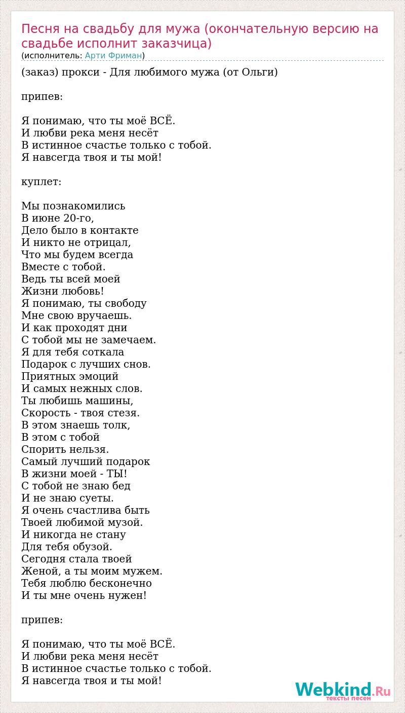 (заказ) прокси - Для любимого мужа (от Ольги) припев: Я понимаю, что ты моё ВСЁ. И любви река меня несёт В истинное счастье только с тобой. Я навсегда твоя и ты мой! куплет: Мы познакомились В июне 20-го, Дело было в контакте И никто не отрицал, Что мы будем всегда Вместе с тобой. Ведь ты всей моей Жизни любовь! Я понимаю, ты свободу Мне свою вручаешь. И как проходят дни С тобой мы не замечаем. Я для тебя соткала Подарок с лучших снов. Приятных эмоций И самых нежных слов. Ты любишь машины, Скорость - твоя стезя. В этом знаешь толк, В этом с тобой Спорить нельзя. Самый лучший подарок В жизни моей - ТЫ! С тобой не знаю бед И не знаю суеты. Я очень счастлива быть Твоей любимой музой. И никогда не стану Для тебя обузой. Сегодня стала твоей Женой, а ты моим мужем. Тебя люблю бесконечно И ты мне очень нужен! припев: Я понимаю, что ты моё ВСЁ. И любви река меня несёт В истинное счастье только с тобой. Я навсегда твоя и ты мой!