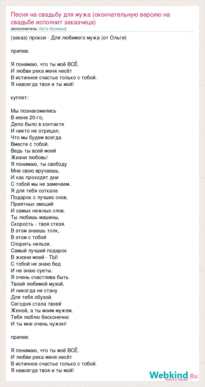 (заказ) прокси - Для любимого мужа (от Ольги) припев: Я понимаю, что ты моё ВСЁ. И любви река меня несёт В истинное счастье только с тобой. Я навсегда твоя и ты мой! куплет: Мы познакомились В июне 20-го, Дело было в контакте И никто не отрицал, Что мы будем всегда Вместе с тобой. Ведь ты всей моей Жизни любовь! Я понимаю, ты свободу Мне свою вручаешь. И как проходят дни С тобой мы не замечаем. Я для тебя соткала Подарок с лучших снов. Приятных эмоций И самых нежных слов. Ты любишь машины, Скорость - твоя стезя. В этом знаешь толк, В этом с тобой Спорить нельзя. Самый лучший подарок В жизни моей - ТЫ! С тобой не знаю бед И не знаю суеты. Я очень счастлива быть Твоей любимой музой. И никогда не стану Для тебя обузой. Сегодня стала твоей Женой, а ты моим мужем. Тебя люблю бесконечно И ты мне очень нужен! припев: Я понимаю, что ты моё ВСЁ. И любви река меня несёт В истинное счастье только с тобой. Я навсегда твоя и ты мой!