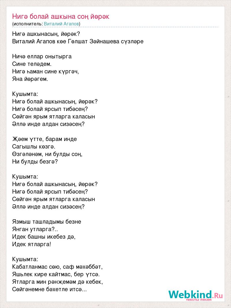 Нигә ашкынасың, йөрәк? Виталий Агапов көе Гөлшат Зәйнашева сүзләре Ничә еллар онытырга Сине теләдем. Нигә һаман сине күргәч, Яна йөрәгем. Кушымта: Нигә болай ашкынасың, йөрәк? Нигә болай ярсып тибәсең? Сөйгән ярым ятларга каласын Әллә инде алдан сизәсең? Җәем үтте, барам инде Сагышлы көзгә. Өзгәләнәм, ни булды соң, Ни булды безгә? Кушымта: Нигә болай ашкынасың, йөрәк? Нигә болай ярсып тибәсең? Сөйгән ярым ятларга каласын Әллә инде алдан сизәсең? Язмыш ташладымы безне Янган утларга?.. Идек башны икебез дә, Идек ятларга! Кушымта: Кабатланмас сөю, саф мәхәббәт, Яшьлек кире кайтмас, бер үтсә. Ятларга мин рәнҗемәм дә кебек, Сөйгәнемне бәхетле итсә...