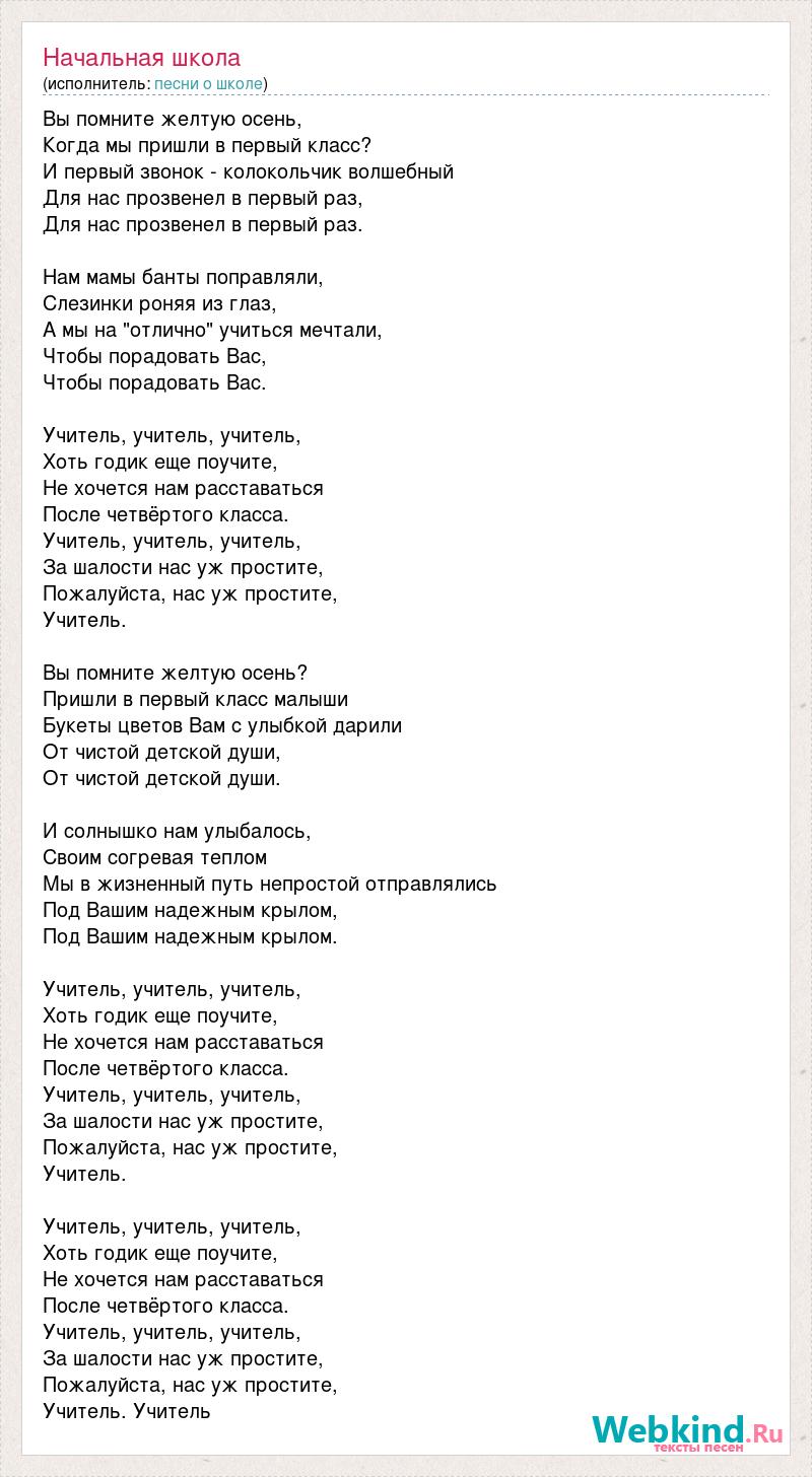 Вы помните желтую осень, Когда мы пришли в первый класс? И первый звонок - колокольчик волшебный Для нас прозвенел в первый раз, Для нас прозвенел в первый раз. Нам мамы банты поправляли, Слезинки роняя из глаз, А мы на "отлично" учиться мечтали, Чтобы порадовать Вас, Чтобы порадовать Вас. Учитель, учитель, учитель, Хоть годик еще поучите, Не хочется нам расставаться После четвёртого класса. Учитель, учитель, учитель, За шалости нас уж простите, Пожалуйста, нас уж простите, Учитель. Вы помните желтую осень? Пришли в первый класс малыши Букеты цветов Вам с улыбкой дарили От чистой детской души, От чистой детской души. И солнышко нам улыбалось, Своим согревая теплом Мы в жизненный путь непростой отправлялись Под Вашим надежным крылом, Под Вашим надежным крылом. Учитель, учитель, учитель, Хоть годик еще поучите, Не хочется нам расставаться После четвёртого класса. Учитель, учитель, учитель, За шалости нас уж простите, Пожалуйста, нас уж простите, Учитель. Учитель, учитель, учитель, Хоть годик еще поучите, Не хочется нам расставаться После четвёртого класса. Учитель, учитель, учитель, За шалости нас уж простите, Пожалуйста, нас уж простите, Учитель. Учитель