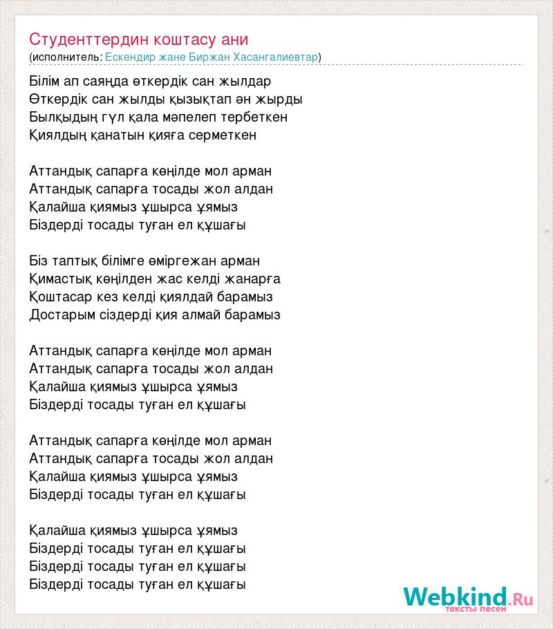 Білім ап саяңда өткердік сан жылдар Өткердік сан жылды қызықтап ән жырды Былқыдың гүл қала мәпелеп тербеткен Қиялдың қанатын қияға серметкен Аттандық сапарға көңілде мол арман Аттандық сапарға тосады жол алдан Қалайша қиямыз ұшырса ұямыз Біздерді тосады туған ел құшағы Біз таптық білімге өміргежан арман Қимастық көңілден жас келді жанарға Қоштасар кез келді қиялдай барамыз Достарым сіздерді қия алмай барамыз Аттандық сапарға көңілде мол арман Аттандық сапарға тосады жол алдан Қалайша қиямыз ұшырса ұямыз Біздерді тосады туған ел құшағы Аттандық сапарға көңілде мол арман Аттандық сапарға тосады жол алдан Қалайша қиямыз ұшырса ұямыз Біздерді тосады туған ел құшағы Қалайша қиямыз ұшырса ұямыз Біздерді тосады туған ел құшағы Біздерді тосады туған ел құшағы Біздерді тосады туған ел құшағы