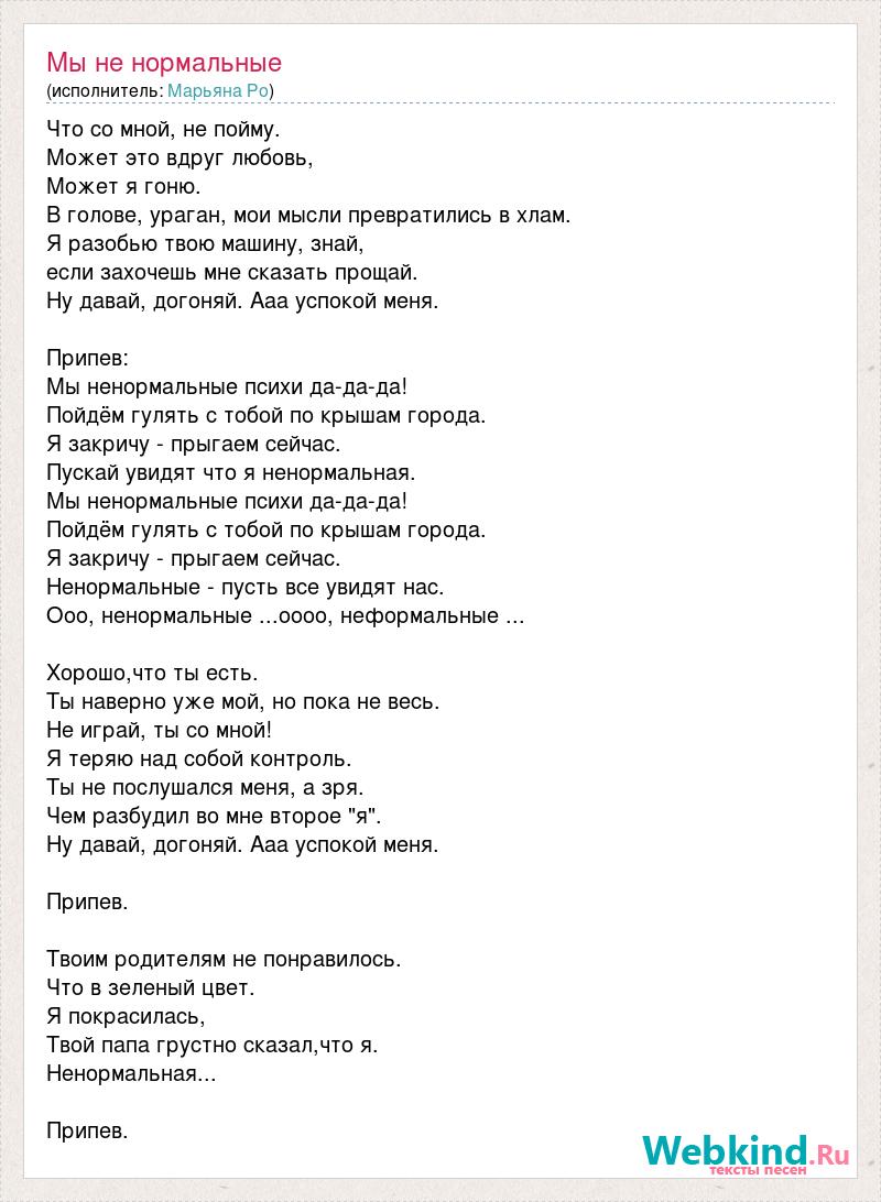 Что со мной, не пойму. Может это вдруг любовь, Может я гоню. В голове, ураган, мои мысли превратились в хлам. Я разобью твою машину, знай, если захочешь мне сказать прощай. Ну давай, догоняй. Ааа успокой меня. Припев: Мы ненормальные психи да-да-да! Пойдём гулять с тобой по крышам города. Я закричу - прыгаем сейчас. Пускай увидят что я ненормальная. Мы ненормальные психи да-да-да! Пойдём гулять с тобой по крышам города. Я закричу - прыгаем сейчас. Ненормальные - пусть все увидят нас. Ооо, ненормальные ...оооо, неформальные ... Хорошо,что ты есть. Ты наверно уже мой, но пока не весь. Не играй, ты со мной! Я теряю над собой контроль. Ты не послушался меня, а зря. Чем разбудил во мне второе "я". Ну давай, догоняй. Ааа успокой меня. Припев. Твоим родителям не понравилось. Что в зеленый цвет. Я покрасилась, Твой папа грустно сказал,что я. Ненормальная... Припев.