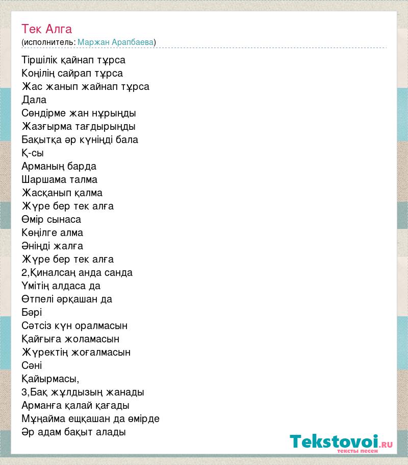 Тіршілік қайнап тұрса Коңілің сайрап тұрса Жас жанып жайнап тұрса Дала Сөндірме жан нұрыңды Жазғырма тағдырыңды Бақытқа әр күніңді бала Қ-сы Арманың барда Шаршама талма Жасқанып қалма Жүре бер тек алға Өмір сынаса Көңілге алма Әніңді жалға Жүре бер тек алға 2,Қиналсаң анда санда Үмітің алдаса да Өтпелі әрқашан да Бәрі Сәтсіз күн оралмасын Қайғыға жоламасын Жүректің жоғалмасын Сәні Қайырмасы, 3,Бақ жұлдызың жанады Арманға қалай қағады Мұңайма ещқашан да өмірде Әр адам бақыт алады