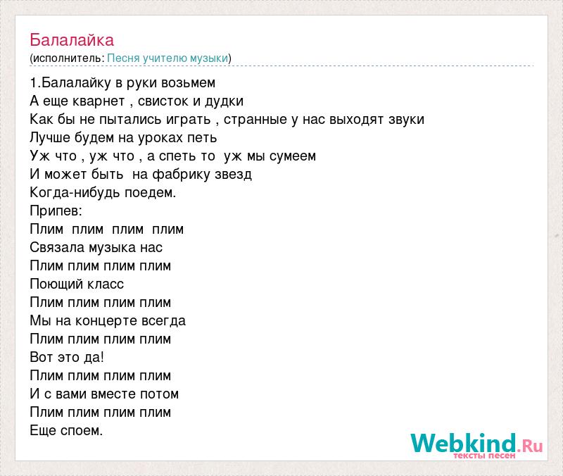 1.Балалайку в руки возьмем А еще кварнет , свисток и дудки Как бы не пытались играть , странные у нас выходят звуки Лучше будем на уроках петь Уж что , уж что , а спеть то уж мы сумеем И может быть на фабрику звезд Когда-нибудь поедем. Припев: Плим плим плим плим Связала музыка нас Плим плим плим плим Поющий класс Плим плим плим плим Мы на концерте всегда Плим плим плим плим Вот это да! Плим плим плим плим И с вами вместе потом Плим плим плим плим Еще споем.