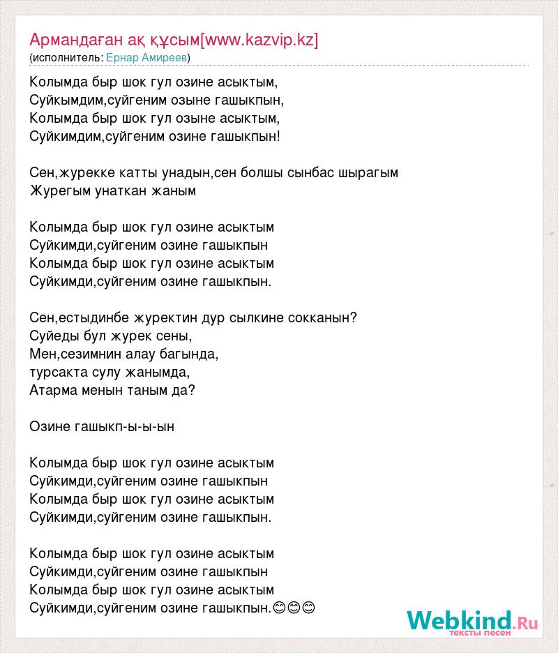 Колымда быр шок гул озине асыктым, Суйкымдим,суйгеним озыне гашыкпын, Колымда быр шок гул озыне асыктым, Суйкимдим,суйгеним озине гашыкпын! Сен,журекке катты унадын,сен болшы сынбас шырагым Журегым унаткан жаным Колымда быр шок гул озине асыктым Суйкимди,суйгеним озине гашыкпын Колымда быр шок гул озине асыктым Суйкимди,суйгеним озине гашыкпын. Сен,естыдинбе журектин дур сылкине сокканын? Суйеды бул журек сены, Мен,сезимнин алау багында, турсакта сулу жанымда, Атарма менын таным да? Озине гашыкп-ы-ы-ын Колымда быр шок гул озине асыктым Суйкимди,суйгеним озине гашыкпын Колымда быр шок гул озине асыктым Суйкимди,суйгеним озине гашыкпын. Колымда быр шок гул озине асыктым Суйкимди,суйгеним озине гашыкпын Колымда быр шок гул озине асыктым Суйкимди,суйгеним озине гашыкпын.😊😊😊💟