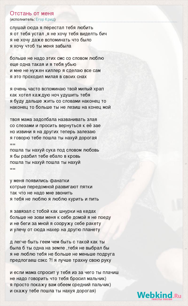 cлушай сюда я перестал тебя любить я от тебя устал ,я не хочу тебя виделть бич я не хочу даже вспоминать что было я хочу чтоб ты меня забыла больше не надо этих смс со словом люблю еще одна такая и я тебя убью и мне не нужен киллер я сделаю все сам я это проходил милая в своих снах я очень часто вспоминаю твой милый храп как хотел каждую ноч удушить тебя я буду дальше жить со словами наконец то наконец то больше ты не лезиш на конец мой твоя мама задолбала названивать злая со слезами и просить вернуться к её зае но извини я на других теперь залезаю я говорю тебе пошла ты нахуй дорогая == пошла ты нахуй сука под словом любовь я бы разбил тебе ебало в кровь пошла ты нахуй пошла ты нахуй == у меня появились фанатки котрые передомной развигают пятки так что не надо мне звонить я тебя не люблю я люблю курить и пить я завязал с тобой как шнурки на кедах больше не зови меня к себе домой я не поеду и не беги за мной я сооружу себе ракету и улечу от сюда нахер на другю планету д легче быть геем чем быть с такой как ты была б ты одна на земле ,тебя не выбрал бы я не люблю тебя не больше не меньше подруга предлогаеш сэкс ?! я лучше трахну свою руку и если мама спросит у тебя из за чего ты плачиш не надо говорить что тебя бросил мальчик) я просто покажу вам обеем средний пальчик) и скажу тебе пошла ты нахуя дорогая)