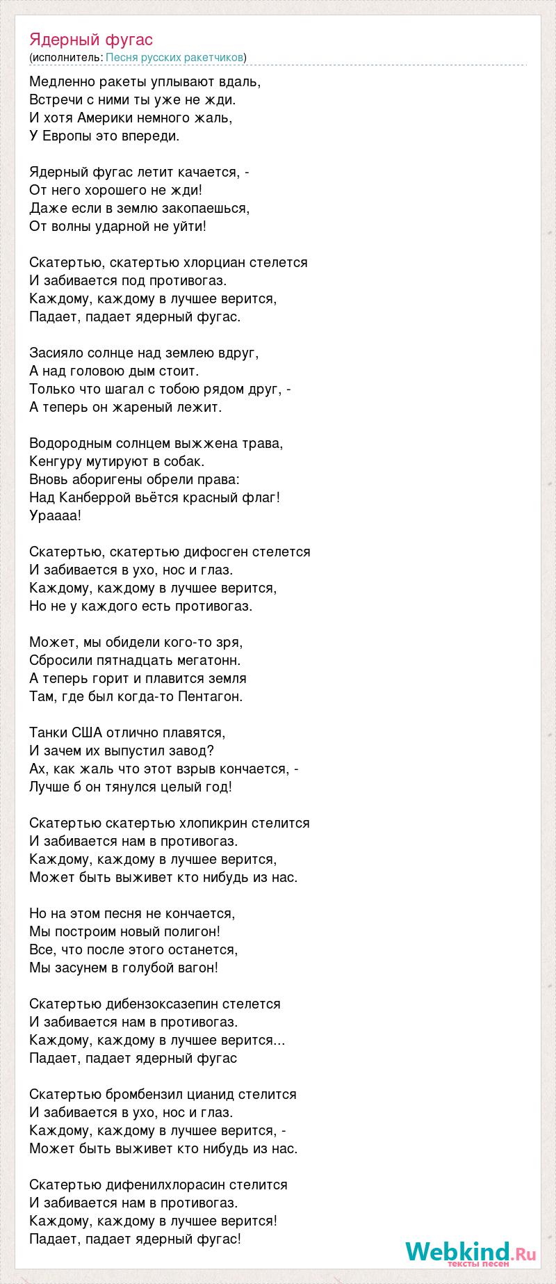Медленно ракеты уплывают вдаль, Встречи с ними ты уже не жди. И хотя Америки немного жаль, У Европы это впереди. Ядерный фугас летит качается, - От него хорошего не жди! Даже если в землю закопаешься, От волны ударной не уйти! Скатертью, скатертью хлорциан стелется И забивается под противогаз. Каждому, каждому в лучшее верится, Падает, падает ядерный фугас. Засияло солнце над землею вдруг, А над головою дым стоит. Только что шагал с тобою рядом друг, - А теперь он жареный лежит. Водородным солнцем выжжена трава, Кенгуру мутируют в собак. Вновь аборигены обрели права: Над Канберрой вьётся красный флаг! Ураааа! Скатертью, скатертью дифосген стелется И забивается в ухо, нос и глаз. Каждому, каждому в лучшее верится, Но не у каждого есть противогаз. Может, мы обидели кого-то зря, Сбросили пятнадцать мегатонн. А теперь горит и плавится земля Там, где был когда-то Пентагон. Танки США отлично плавятся, И зачем их выпустил завод? Ах, как жаль что этот взрыв кончается, - Лучше б он тянулся целый год! Скатертью скатертью хлопикрин стелится И забивается нам в противогаз. Каждому, каждому в лучшее верится, Может быть выживет кто нибудь из нас. Но на этом песня не кончается, Мы построим новый полигон! Все, что после этого останется, Мы засунем в голубой вагон! Скатертью дибензоксазепин стелется И забивается нам в противогаз. Каждому, каждому в лучшее верится... Падает, падает ядерный фугас Скатертью бромбензил цианид стелится И забивается в ухо, нос и глаз. Каждому, каждому в лучшее верится, - Может быть выживет кто нибудь из нас. Скатертью дифенилхлорасин стелится И забивается нам в противогаз. Каждому, каждому в лучшее верится! Падает, падает ядерный фугас!