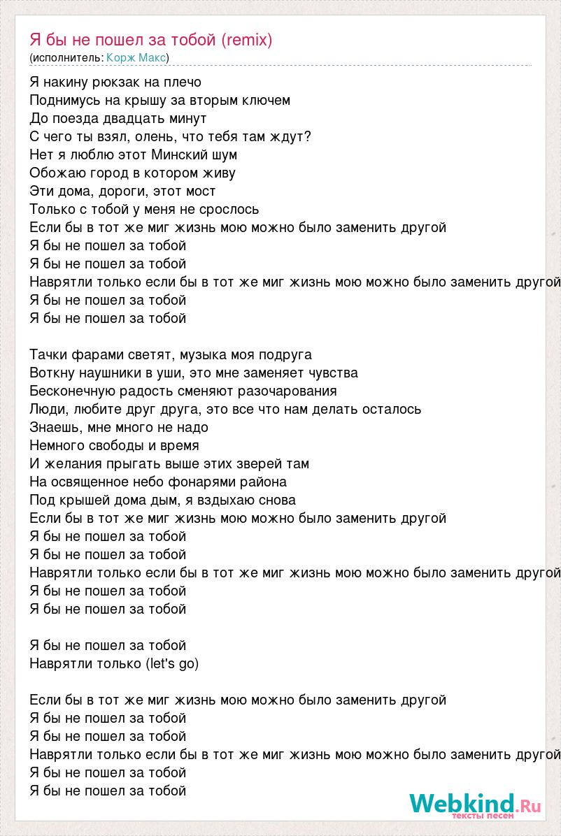 Я накину рюкзак на плечо Поднимусь на крышу за вторым ключем До поезда двадцать минут С чего ты взял, олень, что тебя там ждут? Нет я люблю этот Минский шум Обожаю город в котором живу Эти дома, дороги, этот мост Только с тобой у меня не срослось Если бы в тот же миг жизнь мою можно было заменить другой Я бы не пошел за тобой Я бы не пошел за тобой Наврятли только если бы в тот же миг жизнь мою можно было заменить другой Я бы не пошел за тобой Я бы не пошел за тобой Тачки фарами светят, музыка моя подруга Воткну наушники в уши, это мне заменяет чувства Бесконечную радость сменяют разочарования Люди, любите друг друга, это все что нам делать осталось Знаешь, мне много не надо Немного свободы и время И желания прыгать выше этих зверей там На освященное небо фонарями района Под крышей дома дым, я вздыхаю снова Если бы в тот же миг жизнь мою можно было заменить другой Я бы не пошел за тобой Я бы не пошел за тобой Наврятли только если бы в тот же миг жизнь мою можно было заменить другой Я бы не пошел за тобой Я бы не пошел за тобой Я бы не пошел за тобой Наврятли только (let's go) Если бы в тот же миг жизнь мою можно было заменить другой Я бы не пошел за тобой Я бы не пошел за тобой Наврятли только если бы в тот же миг жизнь мою можно было заменить другой Я бы не пошел за тобой Я бы не пошел за тобой