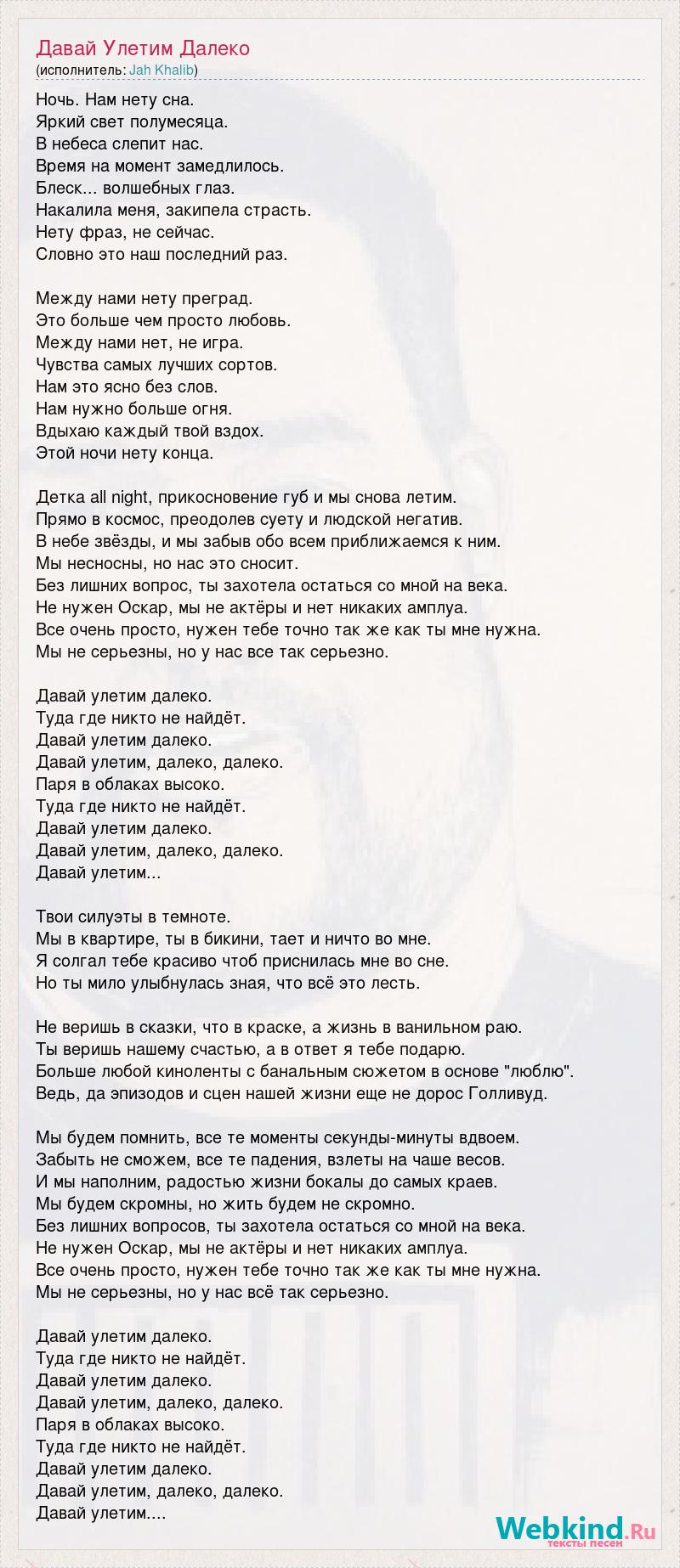 Ночь. Нам нету сна. Яркий свет полумесяца. В небеса слепит нас. Время на момент замедлилось. Блеск... волшебных глаз. Накалила меня, закипела страсть. Нету фраз, не сейчас. Словно это наш последний раз. Между нами нету преград. Это больше чем просто любовь. Между нами нет, не игра. Чувства самых лучших сортов. Нам это ясно без слов. Нам нужно больше огня. Вдыхаю каждый твой вздох. Этой ночи нету конца. Детка all night, прикосновение губ и мы снова летим. Прямо в космос, преодолев суету и людской негатив. В небе звёзды, и мы забыв обо всем приближаемся к ним. Мы несносны, но нас это сносит. Без лишних вопрос, ты захотела остаться со мной на века. Не нужен Оскар, мы не актёры и нет никаких амплуа. Все очень просто, нужен тебе точно так же как ты мне нужна. Мы не серьезны, но у нас все так серьезно. Давай улетим далеко. Туда где никто не найдёт. Давай улетим далеко. Давай улетим, далеко, далеко. Паря в облаках высоко. Туда где никто не найдёт. Давай улетим далеко. Давай улетим, далеко, далеко. Давай улетим... Твои силуэты в темноте. Мы в квартире, ты в бикини, тает и ничто во мне. Я солгал тебе красиво чтоб приснилась мне во сне. Но ты мило улыбнулась зная, что всё это лесть. Не веришь в сказки, что в краске, а жизнь в ванильном раю. Ты веришь нашему счастью, а в ответ я тебе подарю. Больше любой киноленты с банальным сюжетом в основе "люблю". Ведь, да эпизодов и сцен нашей жизни еще не дорос Голливуд. Мы будем помнить, все те моменты секунды-минуты вдвоем. Забыть не сможем, все те падения, взлеты на чаше весов. И мы наполним, радостью жизни бокалы до самых краев. Мы будем скромны, но жить будем не скромно. Без лишних вопросов, ты захотела остаться со мной на века. Не нужен Оскар, мы не актёры и нет никаких амплуа. Все очень просто, нужен тебе точно так же как ты мне нужна. Мы не серьезны, но у нас всё так серьезно. Давай улетим далеко. Туда где никто не найдёт. Давай улетим далеко. Давай улетим, далеко, далеко. Паря в облаках высоко. Туда где никто не найдёт. Давай улетим далеко. Давай улетим, далеко, далеко. Давай улетим....