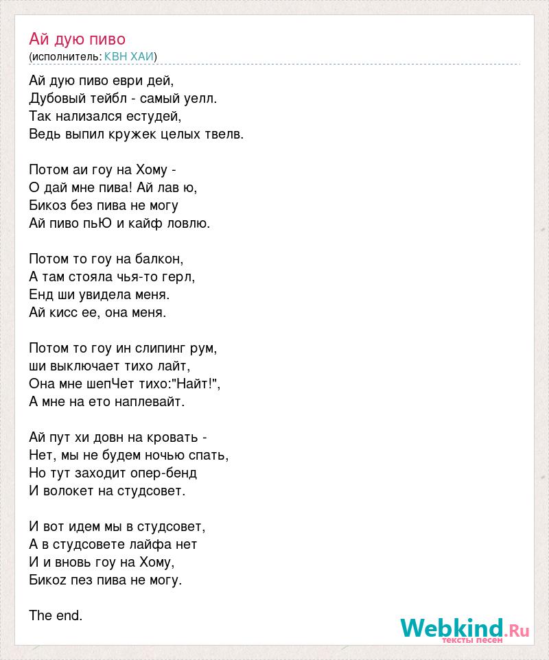 Ай дую пиво еври дей, Дубовый тейбл - самый уелл. Так нализался естудей, Ведь выпил кружек целых твелв. Потом аи гоу на Хому - О дай мне пива! Ай лав ю, Бикоз без пива не могу Ай пиво пьЮ и кайф ловлю. Потом то гоу на балкон, А там стояла чья-то герл, Енд ши увидела меня. Ай кисс ее, она меня. Потом то гоу ин слипинг рум, ши выключает тихо лайт, Она мне шепЧет тихо:"Найт!", А мне на ето наплевайт. Ай пут хи довн на кровать - Нет, мы не будем ночью спать, Но тут заходит опер-бенд И волокет на студсовет. И вот идем мы в студсовет, А в студсовете лайфа нет И и вновь гоу на Хому, Бикоz пез пива не могу. Тhе еnd.
