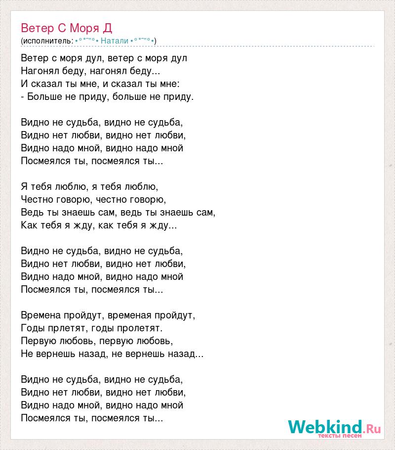 Ветер с моря дул, ветер с моря дул Нагонял беду, нагонял беду... И сказал ты мне, и сказал ты мне: - Больше не приду, больше не приду. Видно не судьба, видно не судьба, Видно нет любви, видно нет любви, Видно надо мной, видно надо мной Посмеялся ты, посмеялся ты... Я тебя люблю, я тебя люблю, Честно говорю, честно говорю, Ведь ты знаешь сам, ведь ты знаешь сам, Как тебя я жду, как тебя я жду... Видно не судьба, видно не судьба, Видно нет любви, видно нет любви, Видно надо мной, видно надо мной Посмеялся ты, посмеялся ты... Времена пройдут, временая пройдут, Годы прлетят, годы пролетят. Первую любовь, первую любовь, Не вернешь назад, не вернешь назад... Видно не судьба, видно не судьба, Видно нет любви, видно нет любви, Видно надо мной, видно надо мной Посмеялся ты, посмеялся ты...