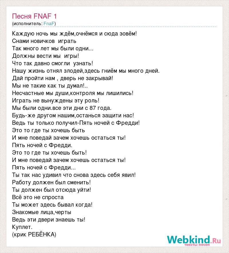 Каждую ночь мы ждём,очнёмся и сюда зовём! Снами новичков играть Так много лет мы были одни... Должны вести мы игры! Что так давно смогли узнать! Нашу жизнь отнял злодей,здесь гниём мы много дней. Дай пройти нам , дверь не закрывай! Мы не такие как ты думал!.. Несчастные мы души,контроля мы лишились! Играть не вынуждены эту роль! Мы были одни.все эти дни с 87 года. Будь-же другом нашим,останься защити нас! Ведь ты только получил-Пять ночей с Фредди! Это то где ты хочешь быть И мне поведай зачем хочешь остаться ты! Пять ночей с Фредди. Это то где ты хочешь быть! И мне поведай зачем хочешь остаться ты! Пять ночей с Фредди... Ты так нас удивил что снова здесь себя явил! Работу должен был сменить! Ты должен был отсюда уйти! Всё это не спроста Ты может здесь бывал когда! Знакомые лица,черты Ведь эти двери знаешь ты! Куплет. (крик РЕБЁНКА)