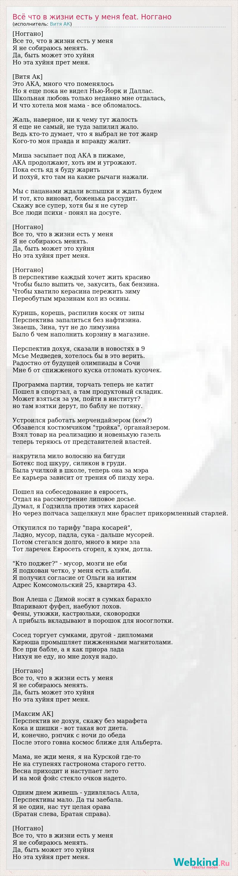 [Ноггано] Все то, что в жизни есть у меня Я не собираюсь менять. Да, быть может это хуйня Но эта хуйня прет меня. [Витя Ак] Это АКА, много что поменялось Но я еще пока не видел Нью-Йорк и Даллас. Школьная любовь только недавно мне отдалась, И что хотела моя мама - все обломалось. Жаль, наверное, ни к чему тут жалость Я еще не самый, не туда запилил жало. Ведь кто-то думает, что я выбрал не тот жанр Кого-то моя правда и вправду жалит. Миша засыпает под АКА в пижаме, АКА продолжают, хоть им и угрожают. Пока есть яд я буду жарить И похуй, кто там на какие рычаги нажали. Мы с пацанами ждали вспышки и ждать будем И тот, кто виноват, боженька рассудит. Скажу все супер, хотя бы я не сутер Все люди психи - понял на досуге. [Ноггано] Все то, что в жизни есть у меня Я не собираюсь менять. Да, быть может это хуйня Но эта хуйня прет меня. [Ноггано] В перспективе каждый хочет жить красиво Чтобы было выпить че, закусить, бак бензина. Чтобы хватило керасина пережить зиму Переобутым мразинам кол из осины. Куришь, корешь, распилив косяк от зипы Перспектива запалиться без нафтизина. Знаешь, Зина, тут не до лимузина Было б чем наполнить корзину в магазине. Перспектив дохуя, сказали в новостях в 9 Мсье Медведев, хотелось бы в это верить. Радостно от будущей олимпиады в Сочи Мне б от спижженого куска отломать кусочек. Программа партии, торчать теперь не катит Пошел в спортзал, а там продуктовый складик. Может взяться за ум, пойти в институт? но там взятки дерут, по баблу не потяну. Устроился работать мерчендайзером (кем?) Обзавелся костюмчиком "тройка", органайзером. Взял товар на реализацию и новенькую газель теперь теряюсь от представителей властей. накрутила мило волосню на бигуди Ботекс под шкуру, силикон в груди. Была училкой в школе, теперь она за мэра Ее карьера зависит от трения об пизду хера. Пошел на собеседование в евросеть, Отдал на рассмотрение липовое досье. Думал, я Годзилла против этих карасей Но через полчаса защелкнул мне браслет прикормленный старлей. Откупился по тарифу "пара косарей", Ладно, мусор, падла, сука - дальше мусорей. Потом стегался долго, много в мире зла Тот ларечек Евросеть сгорел, к хуям, дотла. "Кто поджег?" - мусор, мозги не еби Я подкован четко, у меня есть алиби. Я получил согласие от Ольги на интим Адрес Комсомольский 25, квартира 43. Вон Алеша с Димой носят в сумках барахло Впаривают фуфел, наебуют лохов. Фены, утюжки, кастрюльки, сковородки А прибыль вкладывают в порошок для носоглотки. Сосед торгует сумками, другой - дипломами Кирюша промышляет пижженными магнитолами. Все при бабле, а я как приора лада Нихуя не еду, но мне дохуя надо. [Ноггано] Все то, что в жизни есть у меня Я не собираюсь менять. Да, быть может это хуйня Но эта хуйня прет меня. [Максим АК] Перспектив не дохуя, скажу без марафета Кока и шишки - вот такая вот диета. И, конечно, рэпчик с ночи до обеда После этого говна космос ближе для Альберта. Мама, не жди меня, я на Курской где-то Не на ступенях гастронома старого гетто. Весна приходит и наступает лето И на мой фэйс стекло очков надето. Одним днем живешь - удивлялась Алла, Перспективы мало. Да ты заебала. Я не один, нас тут целая орава (Братан слева, Братан справа). [Ноггано] Все то, что в жизни есть у меня Я не собираюсь менять. Да, быть может это хуйня Но эта хуйня прет меня.