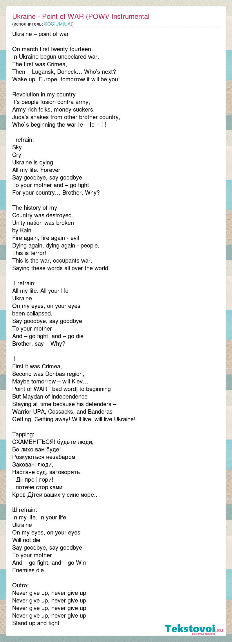 Ukraine – point of war On march first twenty fourteen In Ukraine begun undeclared war. The first was Crimea, Then – Lugansk, Doneck… Who’s next? Wake up, Europe, tomorrow it will be you! Revolution in my country It’s people fusion contra army, Army rich folks, money suckers, Juda’s snakes from other brother country, Who`s beginning the war Ie – Ie – I ! I refrain: Sky Cry Ukraine is dying All my life. Forever Say goodbye, say goodbye To your mother and – go fight For your country… Brother, Why? The history of my Country was destroyed. Unity nation was broken by Kain Fire again, fire again - evil Dying again, dying again - people. This is terror! This is the war, occupants war. Saying these words all over the world. II refrain: All my life. All your life Ukraine On my eyes, on your eyes been collapsed. Say goodbye, say goodbye To your mother And – go fight, and – go die Brother, say – Why? II First it was Crimea, Second was Donbas region, Maybe tomorrow – will Kiev… Point of WAR Has come to beginning But Maydan of independence Staying all time because his defenders – Warrior UPA, Cossacks, and Banderas Getting, Getting away! Will live, will live Ukraine! Tapping: СХАМЕНІТЬСЯ! будьте люди, Бо лихо вам буде! Розкуються незабаром Заковані люди, Настане суд, заговорять І Дніпро і гори! І потече сторіками Кров Дітей ваших у синє море.. . Ш refrain: In my life. In your life Ukraine On my eyes, on your eyes Will not die Say goodbye, say goodbye To your mother And – go fight, and – go Win Enemies die. Outro: Never give up, never give up Never give up, never give up Never give up, never give up Never give up, never give up Stand up and fight