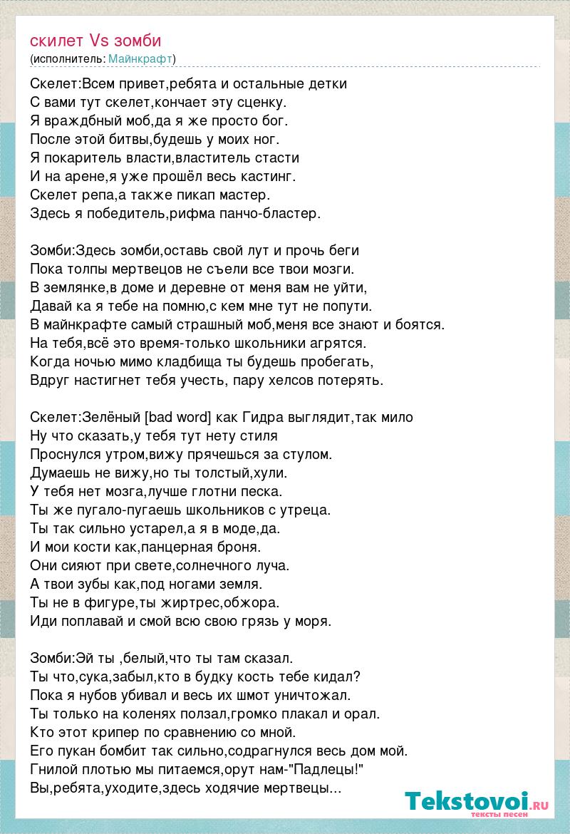 Скелет:Всем привет,ребята и остальные детки С вами тут скелет,кончает эту сценку. Я враждбный моб,да я же просто бог. После этой битвы,будешь у моих ног. Я покаритель власти,властитель стасти И на арене,я уже прошёл весь кастинг. Скелет репа,а также пикап мастер. Здесь я победитель,рифма панчо-бластер. Зомби:Здесь зомби,оставь свой лут и прочь беги Пока толпы мертвецов не съели все твои мозги. В землянке,в доме и деревне от меня вам не уйти, Давай ка я тебе на помню,с кем мне тут не попути. В майнкрафте самый страшный моб,меня все знают и боятся. На тебя,всё это время-только школьники агрятся. Когда ночью мимо кладбища ты будешь пробегать, Вдруг настигнет тебя учесть, пару хелсов потерять. Скелет:Зелёный [bad word] как Гидра выглядит,так мило Ну что сказать,у тебя тут нету стиля Проснулся утром,вижу прячешься за стулом. Думаешь не вижу,но ты толстый,хули. У тебя нет мозга,лучше глотни песка. Ты же пугало-пугаешь школьников с утреца. Ты так сильно устарел,а я в моде,да. И мои кости как,панцерная броня. Они сияют при свете,солнечного луча. А твои зубы как,под ногами земля. Ты не в фигуре,ты жиртрес,обжора. Иди поплавай и смой всю свою грязь у моря. Зомби:Эй ты ,белый,что ты там сказал. Ты что,сука,забыл,кто в будку кость тебе кидал? Пока я нубов убивал и весь их шмот уничтожал. Ты только на коленях ползал,громко плакал и орал. Кто этот крипер по сравнению со мной. Его пукан бомбит так сильно,содрагнулся весь дом мой. Гнилой плотью мы питаемся,орут нам-"Падлецы!" Вы,ребята,уходите,здесь ходячие мертвецы...