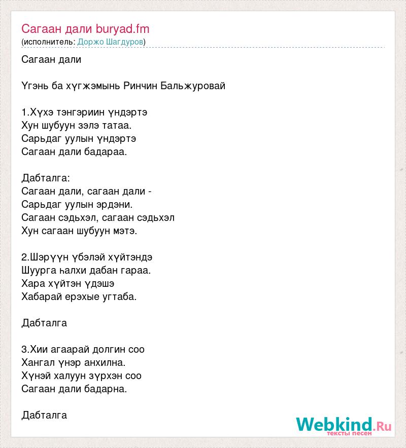 Сагаан дали Үгэнь ба хүгжэмынь Ринчин Бальжуровай 1.Хүхэ тэнгэриин үндэртэ Хун шубуун зэлэ татаа. Сарьдаг уулын үндэртэ Сагаан дали бадараа. Дабталга: Сагаан дали, сагаан дали - Сарьдаг уулын эрдэни. Сагаан сэдьхэл, сагаан сэдьхэл Хун сагаан шубуун мэтэ. 2.Шэрүүн үбэлэй хүйтэндэ Шуурга һалхи дабан гараа. Хара хүйтэн үдэшэ Хабарай ерэхые угтаба. Дабталга 3.Хии агаарай долгин соо Хангал үнэр анхилна. Хүнэй халуун зүрхэн соо Сагаан дали бадарна. Дабталга
