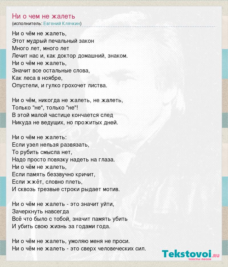 Ни о чём не жалеть, Этот мудрый печальный закон Много лет, много лет Лечит нас и, как доктор домашний, знаком. Ни о чём не жалеть, Значит все остальные слова, Как леса в ноябре, Опустели, и гулко грохочет листва. Ни о чём, никогда не жалеть, не жалеть, Только "не", только "не"! В этой малой частице кончается след Никуда не ведущих, но прожитых дней. Ни о чём не жалеть: Если узел нельзя развязать, То рубить смысла нет, Надо просто повязку надеть на глаза. Ни о чём не жалеть, Если память беззвучно кричит, Если жжёт, словно плеть, И сквозь трезвые строки рыдает мотив. Ни о чём не жалеть - это значит уйти, Зачеркнуть навсегда Всё что было с тобой, значит память убить И убить свою жизнь за годами года. Ни о чём не жалеть, умоляю меня не проси. Ни о чём не жалеть - это сверх человеческих сил.