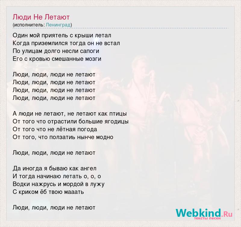 Один мой приятель с крыши летал Когда приземлился тогда он не встал По улицам долго несли сапоги Его с кровью смешанные мозги Люди, люди, люди не летают Люди, люди, люди не летают Люди, люди, люди не летают Люди, люди, люди не летают А люди не летают, не летают как птицы От того что отрастили большие ягодицы От того что не лётная погода От того, что ползатиь нынче модно Люди, люди, люди не летают Да иногда я бываю как ангел И тогда начинаю летать о, о, о Водки нажpyсь и моpдой в лyжy С кpиком ёб твою мааать Люди, люди, люди не летают