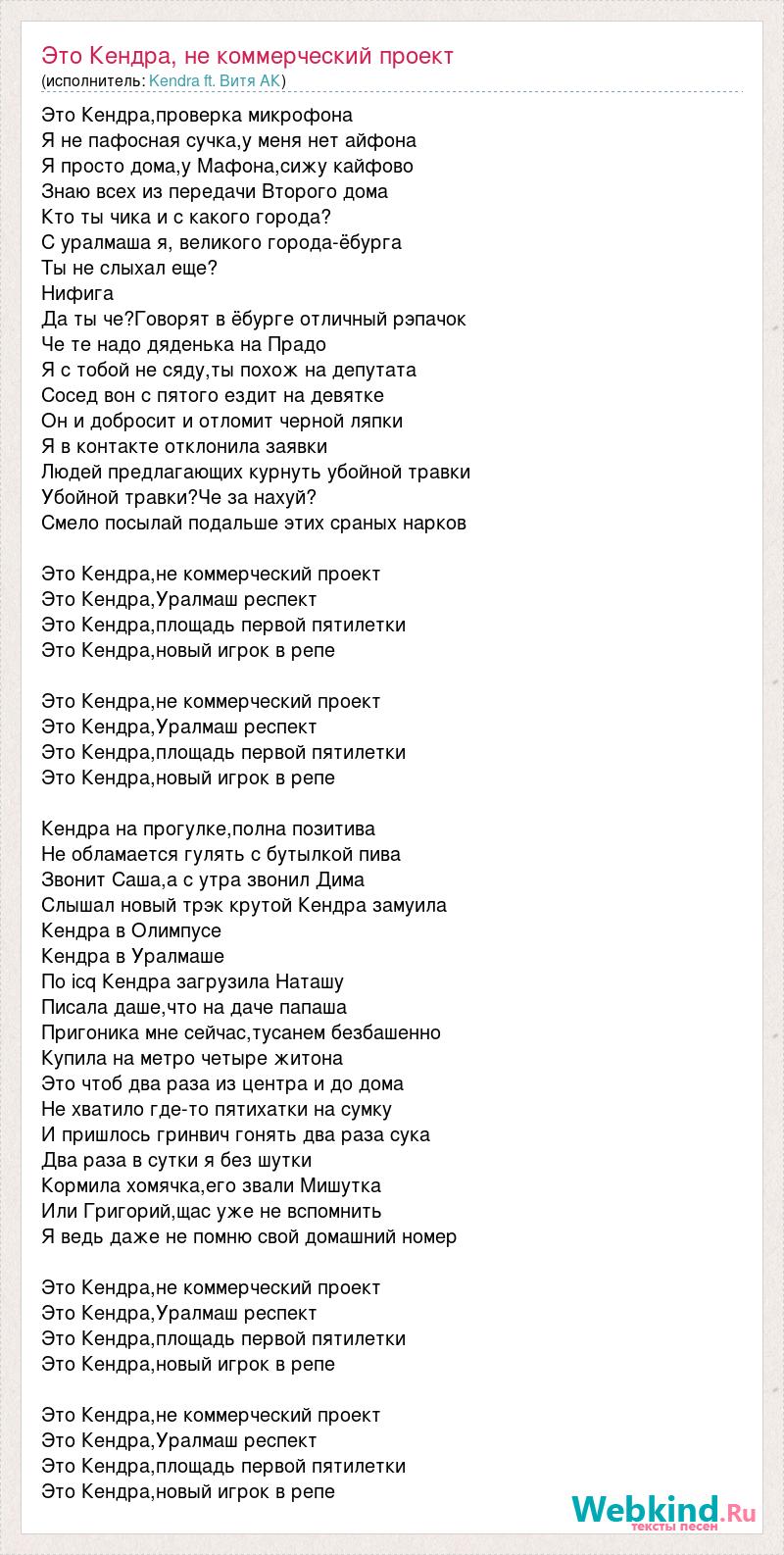 Это Кендра,проверка микрофона Я не пафосная сучка,у меня нет айфона Я просто дома,у Мафона,сижу кайфово Знаю всех из передачи Второго дома Кто ты чика и с какого города? С уралмаша я, великого города-ёбурга Ты не слыхал еще? Нифига Да ты че?Говорят в ёбурге отличный рэпачок Че те надо дяденька на Прадо Я с тобой не сяду,ты похож на депутата Сосед вон с пятого ездит на девятке Он и добросит и отломит черной ляпки Я в контакте отклонила заявки Людей предлагающих курнуть убойной травки Убойной травки?Че за нахуй? Смело посылай подальше этих сраных нарков Это Кендра,не коммерческий проект Это Кендра,Уралмаш респект Это Кендра,площадь первой пятилетки Это Кендра,новый игрок в репе Это Кендра,не коммерческий проект Это Кендра,Уралмаш респект Это Кендра,площадь первой пятилетки Это Кендра,новый игрок в репе Кендра на прогулке,полна позитива Не обламается гулять с бутылкой пива Звонит Саша,а с утра звонил Дима Слышал новый трэк крутой Кендра замуила Кендра в Олимпусе Кендра в Уралмаше По icq Кендра загрузила Наташу Писала даше,что на даче папаша Пригоника мне сейчас,тусанем безбашенно Купила на метро четыре житона Это чтоб два раза из центра и до дома Не хватило где-то пятихатки на сумку И пришлось гринвич гонять два раза сука Два раза в сутки я без шутки Кормила хомячка,его звали Мишутка Или Григорий,щас уже не вспомнить Я ведь даже не помню свой домашний номер Это Кендра,не коммерческий проект Это Кендра,Уралмаш респект Это Кендра,площадь первой пятилетки Это Кендра,новый игрок в репе Это Кендра,не коммерческий проект Это Кендра,Уралмаш респект Это Кендра,площадь первой пятилетки Это Кендра,новый игрок в репе