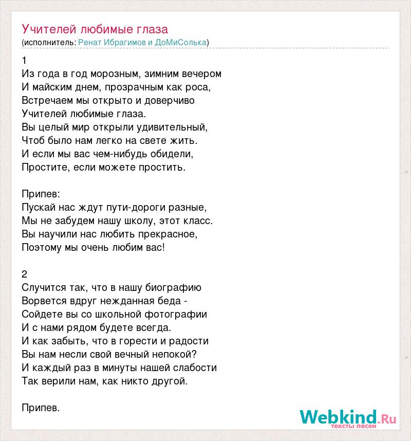 1 Из года в год морозным, зимним вечером И майским днем, прозрачным как роса, Встречаем мы открыто и доверчиво Учителей любимые глаза. Вы целый мир открыли удивительный, Чтоб было нам легко на свете жить. И если мы вас чем-нибудь обидели, Простите, если можете простить. Припев: Пускай нас ждут пути-дороги разные, Мы не забудем нашу школу, этот класс. Вы научили нас любить прекрасное, Поэтому мы очень любим вас! 2 Случится так, что в нашу биографию Ворвется вдруг нежданная беда - Сойдете вы со школьной фотографии И с нами рядом будете всегда. И как забыть, что в горести и радости Вы нам несли свой вечный непокой? И каждый раз в минуты нашей слабости Так верили нам, как никто другой. Припев.