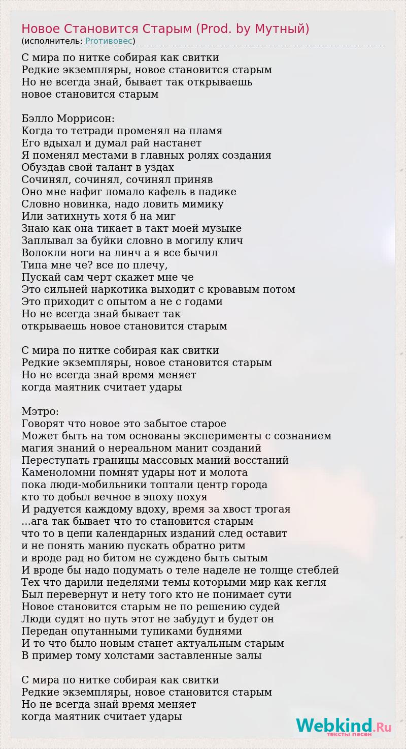 С мира по нитке собирая как свитки Редкие экземпляры, новое становится старым Но не всегда знай, бывает так открываешь новое становится старым Бэлло Моррисон: Когда то тетради променял на пламя Его вдыхал и думал рай настанет Я поменял местами в главных ролях создания Обуздав свой талант в уздах Сочинял, сочинял, сочинял приняв Оно мне нафиг ломало кафель в падике Словно новинка, надо ловить мимику Или затихнуть хотя б на миг Знаю как она тикает в такт моей музыке Заплывал за буйки словно в могилу клич Волокли ноги на линч а я все бычил Типа мне че? все по плечу, Пускай сам черт скажет мне че Это сильней наркотика выходит с кровавым потом Это приходит с опытом а не с годами Но не всегда знай бывает так открываешь новое становится старым С мира по нитке собирая как свитки Редкие экземпляры, новое становится старым Но не всегда знай время меняет когда маятник считает удары Мэтро: Говорят что новое это забытое старое Может быть на том основаны эксперименты с сознанием магия знаний о нереальном манит созданий Переступать границы массовых маний восстаний Каменоломни помнят удары нот и молота пока люди-мобильники топтали центр города кто то добыл вечное в эпоху похуя И радуется каждому вдоху, время за хвост трогая ...ага так бывает что то становится старым что то в цепи календарных изданий след оставит и не понять манию пускать обратно ритм и вроде рад но битом не суждено быть сытым И вроде бы надо подумать о теле наделе не толще стеблей Тех что дарили неделями темы которыми мир как кегля Был перевернут и нету того кто не понимает сути Новое становится старым не по решению судей Люди судят но путь этот не забудут и будет он Передан опутанными тупиками буднями И то что было новым станет актуальным старым В пример тому холстами заставленные залы С мира по нитке собирая как свитки Редкие экземпляры, новое становится старым Но не всегда знай время меняет когда маятник считает удары