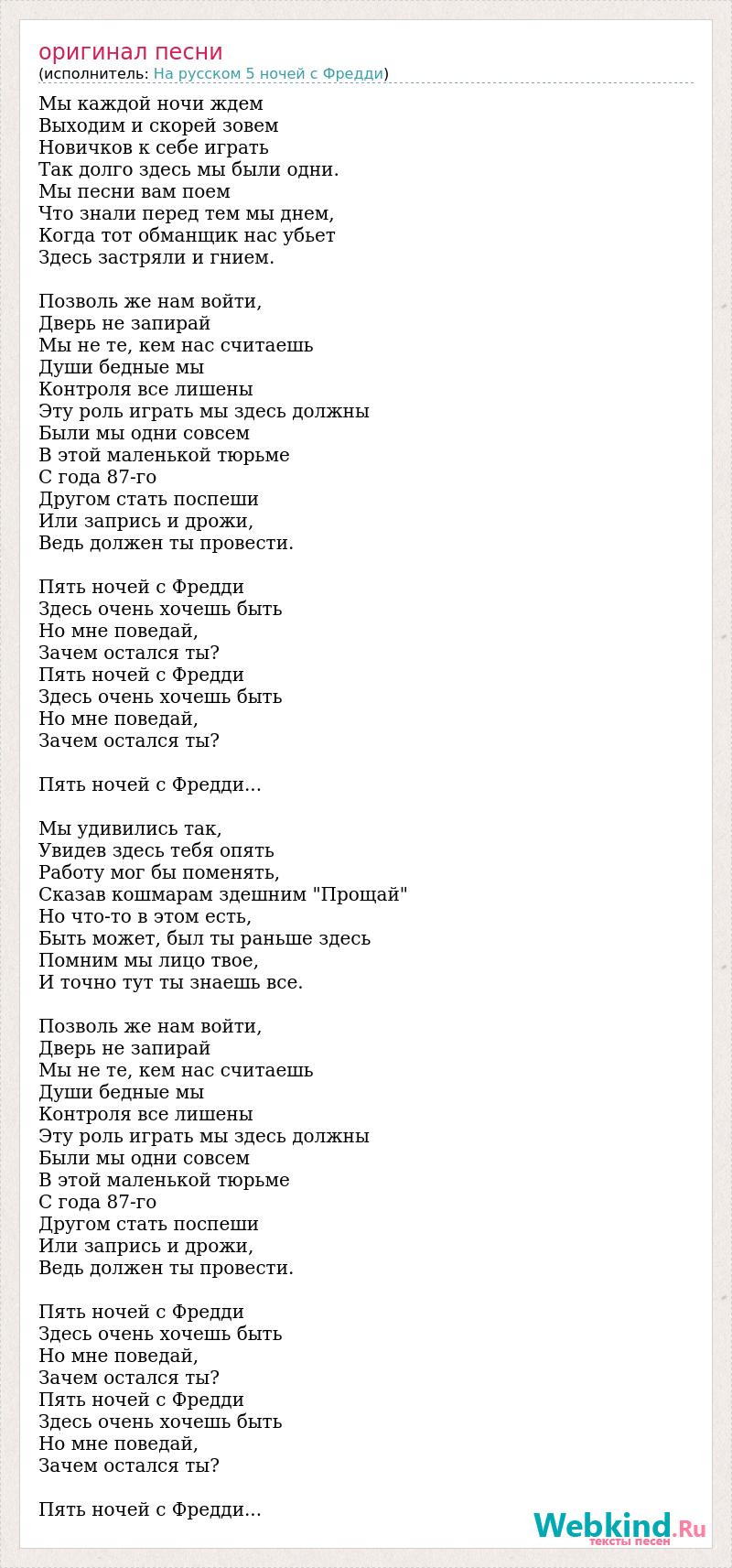Мы каждой ночи ждем Выходим и скорей зовем Новичков к себе играть Так долго здесь мы были одни. Мы песни вам поем Что знали перед тем мы днем, Когда тот обманщик нас убьет Здесь застряли и гнием. Позволь же нам войти, Дверь не запирай Мы не те, кем нас считаешь Души бедные мы Контроля все лишены Эту роль играть мы здесь должны Были мы одни совсем В этой маленькой тюрьме С года 87-го Другом стать поспеши Или запрись и дрожи, Ведь должен ты провести. Пять ночей с Фредди Здесь очень хочешь быть Но мне поведай, Зачем остался ты? Пять ночей с Фредди Здесь очень хочешь быть Но мне поведай, Зачем остался ты? Пять ночей с Фредди... Мы удивились так, Увидев здесь тебя опять Работу мог бы поменять, Сказав кошмарам здешним "Прощай" Но что-то в этом есть, Быть может, был ты раньше здесь Помним мы лицо твое, И точно тут ты знаешь все. Позволь же нам войти, Дверь не запирай Мы не те, кем нас считаешь Души бедные мы Контроля все лишены Эту роль играть мы здесь должны Были мы одни совсем В этой маленькой тюрьме С года 87-го Другом стать поспеши Или запрись и дрожи, Ведь должен ты провести. Пять ночей с Фредди Здесь очень хочешь быть Но мне поведай, Зачем остался ты? Пять ночей с Фредди Здесь очень хочешь быть Но мне поведай, Зачем остался ты? Пять ночей с Фредди...