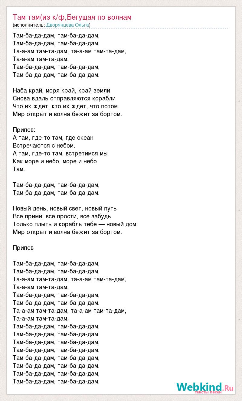 Там-ба-да-дам, там-ба-да-дам, Там-ба-да-дам, там-ба-да-дам, Та-а-ам там-та-дам, та-а-ам там-та-дам, Та-а-ам там-та-дам. Там-ба-да-дам, там-ба-да-дам, Там-ба-да-дам, там-ба-да-дам. Наба край, моря край, край земли Снова вдаль отправляются корабли Что их ждет, кто их ждет, что потом Мир открыт и волна бежит за бортом. Припев: А там, где-то там, где океан Встречаются с небом. А там, где-то там, встретимся мы Как море и небо, море и небо Там. Там-ба-да-дам, там-ба-да-дам, Там-ба-да-дам, там-ба-да-дам. Новый день, новый свет, новый путь Все прими, все прости, все забудь Только плыть и корабль тебе — новый дом Мир открыт и волна бежит за бортом. Припев Там-ба-да-дам, там-ба-да-дам, Там-ба-да-дам, там-ба-да-дам, Та-а-ам там-та-дам, та-а-ам там-та-дам, Та-а-ам там-та-дам. Там-ба-да-дам, там-ба-да-дам, Там-ба-да-дам, там-ба-да-дам. Та-а-ам там-та-дам, та-а-ам там-та-дам, Та-а-ам там-та-дам. Там-ба-да-дам, там-ба-да-дам, Там-ба-да-дам, там-ба-да-дам. Там-ба-да-дам, там-ба-да-дам, Там-ба-да-дам, там-ба-да-дам. Там-ба-да-дам, там-ба-да-дам, Там-ба-да-дам, там-ба-да-дам. Там-ба-да-дам, там-ба-да-дам, Там-ба-да-дам, там-ба-да-дам.