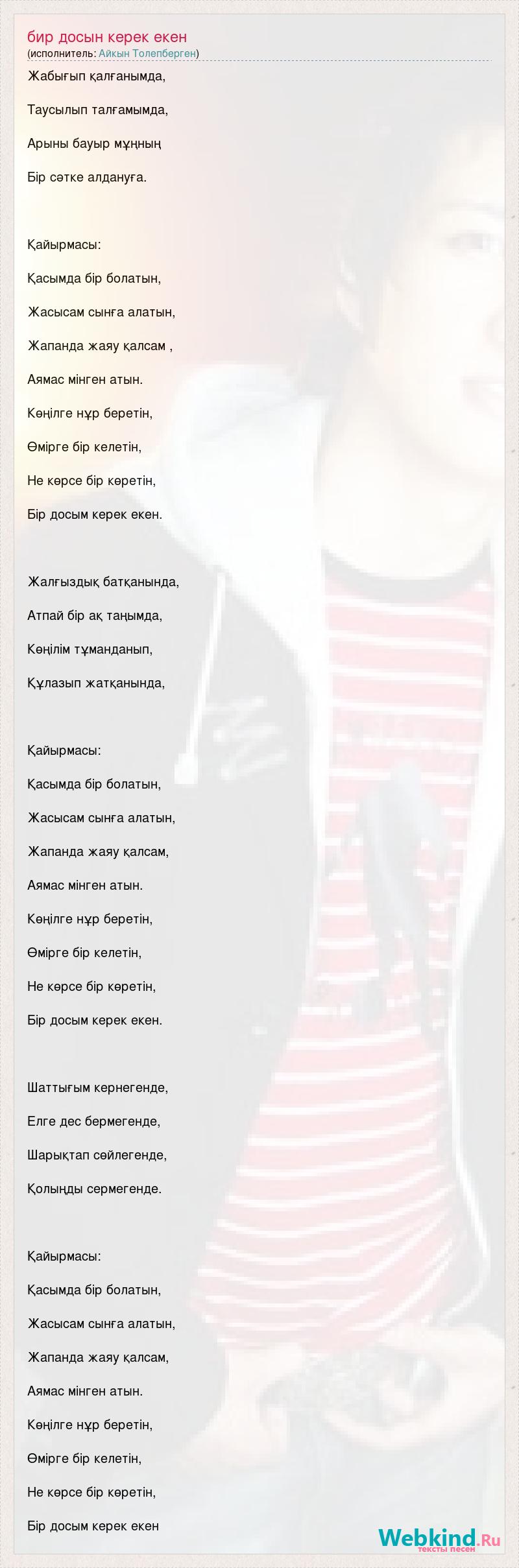 Жабығып қалғанымда, Таусылып талғамымда, Арыны бауыр мұңның Бір сәтке алдануға. Қайырмасы: Қасымда бір болатын, Жасысам сынға алатын, Жапанда жаяу қалсам , Аямас мінген атын. Көңілге нұр беретін, Өмірге бір келетін, Не көрсе бір көретін, Бір досым керек екен. Жалғыздық батқанында, Атпай бір ақ таңымда, Көңілім тұманданып, Құлазып жатқанында, Қайырмасы: Қасымда бір болатын, Жасысам сынға алатын, Жапанда жаяу қалсам, Аямас мінген атын. Көңілге нұр беретін, Өмірге бір келетін, Не көрсе бір көретін, Бір досым керек екен. Шаттығым кернегенде, Елге дес бермегенде, Шарықтап сөйлегенде, Қолыңды сермегенде. Қайырмасы: Қасымда бір болатын, Жасысам сынға алатын, Жапанда жаяу қалсам, Аямас мінген атын. Көңілге нұр беретін, Өмірге бір келетін, Не көрсе бір көретін, Бір досым керек екен
