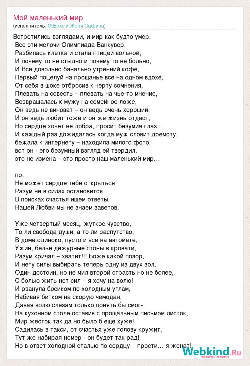 Встретились взглядами, и мир как будто умер, Все эти мелочи Олимпиада Ванкувер, Разбилась клетка и стала птицей вольной, И почему то не стыдно и почему то не больно, И Все довольно банально утренний кофе, Первый поцелуй на прощанье все на одном вдохе, От себя в шоке отбросив к черту сомнения, Плевать на совесть – плевать на чье-то мнение, Возвращалась к мужу на семейное ложе, Он ведь не виноват – он ведь очень хороший, И он ведь любит тоже и он же жизнь отдаст, Но сердце хочет не добра, просит безумия глаз… И каждый раз дожидалась когда муж словит дремоту, бежала к интернету – находила милого фото, вот он - его безумный взгляд ей твердил, это не измена – это просто наш маленький мир… пр. Не может сердце тебе открыться Разум не в силах остановится В поисках счастья ищем ответы, Нашей Любви мы не знаем заветов. Уже четвертый месяц, жуткое чувство, То ли свобода души, а то ли распутство, В доме одиноко, пусто и все на автомате, Ужин, белье дежурные стоны в кровати, Разум кричал – хватит!!! Боже какой позор, И нету силы выбирать теперь одну из двух зол, Один достоин, но не мил второй страсть но не более, С болью жить нет сил – я хочу на волю! И рванула босиком по холодным углам, Набивая битком на скорую чемодан, Давая волю слезам только понять бы смог- На кухонном столе оставив с прощальным письмом листок, Мир жесток так да но было б еще хуже! Садилась в такси, от счастья уже голову кружит, Тут же набирая номер - он будет так рад! Но в ответ холодной сталью по сердцу – прости… я женат!